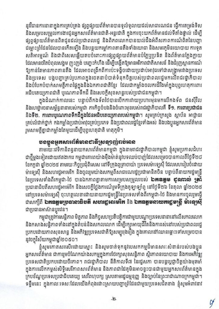 តាមរយៈវេទិកានិពន្ធនាយកសារព័ត៌មានកម្ពុជា ក្នុងនាមរាជរដ្ឋាភិបាលកម្ពុជា ខ្ញុំសូមប្រកាសជំហរ ជាថ្មីម្តងទៀតដោយឥតងាករ កម្ពុជាគោរពយ៉ាងម៉ឺងម៉ាត់នូវបទឈប់បាញ់ដែលសម្រេចបានកាលពីថ្ងៃទី២៨ ខែកក្កដា ឆ្នាំ២០២៥ តាមរយៈកិច្ចប្រជុំពិសេស នៅទីក្រុងពូត្រាចាយ៉ា ប្រទេសម៉ាឡេស៊ី ដែលសហរៀបចំដោយ ម៉ាឡេស៊ី និងសហរដ្ឋអាមេរិក និងចូលរួមយ៉ាងសកម្មពីសាធារណរដ្ឋប្រជាមានិតចិន បន្ទាប់ពីនាយករដ្ឋមន្តី នៃប្រទេសទាំងពីរកម្ពុជា-ថៃ បានឯកភាពគ្នាតាមការសម្របសម្រួលរបស់ ឯកឧត្តម ដូណាល់ ត្រាំ ប្រធានាធិបតីសហរដ្ឋអាម៉េរិក និងសេចក្តីថ្លែងការណ៍រួមទីក្រុងគូឡាឡាំពួ នៅថ្ងៃទី២៦ ខែតុលា ឆ្នាំ២០២៥ នៅប្រទេសម៉ាឡេស៊ី ចុះហត្ថលេខាដោយនាយករដ្ឋមន្ត្រីនៃប្រទេសទាំងពីរកម្ពុជា-ថៃ និងមានការចូលរួមធ្វើ ជាសាក្សីពី ឯកឧត្តមប្រធានាធិបតី សហរដ្ឋអាមេរិក និង ឯកឧត្តមនាយករដ្ឋមន្ត្រី ម៉ាឡេស៊ី ជាប្រធានអាស៊ានប្តូរវេន។
