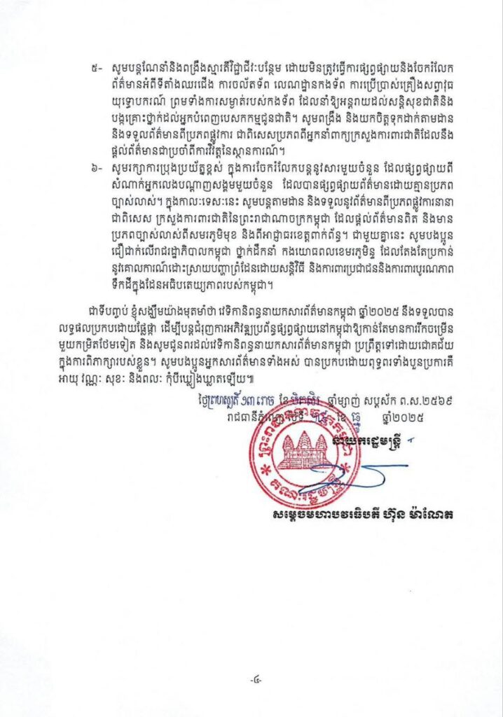 ៤- រាល់ការផ្សព្វផ្សាយព័ត៌មាន ជាពិសេស ព័ត៌មានទាក់ទងនឹងបញ្ហាជម្លោះព្រំដែនជាមួយប្រទេស ជិតខាង ត្រូវយកចិត្តទុកដាក់ត្រួតពិនិត្យផ្ទៀងផ្ទាត់ជាមួយប្រភពព័ត៌មានផ្លូវការរបស់ថ្នាក់ដឹកនាំ ក្រសួង ស្ថាប័នមានសមត្ថកិច្ចឱ្យបានហ្មត់ចត់ ចៀសវាងការផ្សព្វផ្សាយព័ត៌មានខុសឬមិនពិត ព័ត៌មានប្រឌិតញុះញង់បញ្ឆេះកំហឹងជាតិសាសន៍ និងពង្រីកបញ្ហាជម្លោះឱ្យកាន់តែធំធ្វើឱ្យប៉ះពាល់ ដល់សន្តិសុខជាតិ ការបំបែកបំបាក់សាមគ្គីជាតិនិងឯកភាពជាតិ ឬបង្កឱ្យមានការភាន់ច្រឡំ ក្នុងចំណោមសាធារណជនជាតិ-អន្តរជាតិ។ រាល់ការផ្សាយនិងចែករំលែកព័ត៌មាន ត្រូវធានាថា នឹងមិនធ្វើឱ្យប៉ះពាល់ដល់ទឹកចិត្តកងទ័ព ឬបង្កការរំខានដល់ការបំពេញបេសកកម្មរបស់កងទ័ពជួរមុខឡើយ។