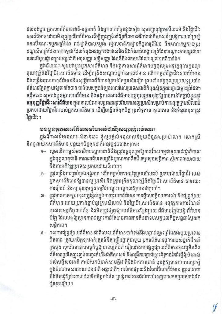 ក្នុងន័យនេះ សូមបងប្អូនអ្នកសារព័ត៌មាន និងអង្គភាពសារព័ត៌មានបន្តចូលរួមអនុវត្តនូវលក្ខខណ្ឌ គុណវុឌ្ឍនិងវិជ្ជាជីវៈសារព័ត៌មាន ដើម្បីពង្រឹងសណ្តាប់ធ្នាប់សារព័ត៌មាន លើកកម្ពស់វិជ្ជាជីវៈសារព័ត៌មាន និងពង្រឹងគុណភាពព័ត៌មាននិងសុវត្ថិភាពព័ត៌មានឱ្យកាន់តែប្រសើរឡើង ព្រមទាំងបន្តចូលរួមប្រយុទ្ធប្រឆាំង