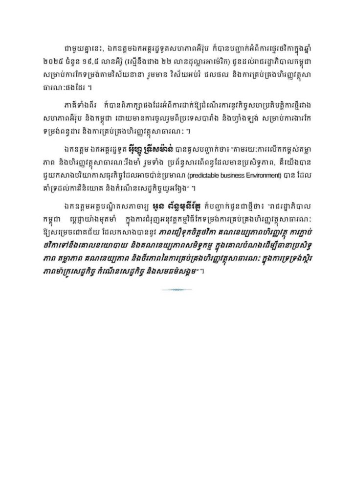 ជាមួយគ្នានេះ, ឯកឧត្តមឯកអគ្គរដ្ឋទូតសហភាពអឺរ៉ុប ក៏បានបញ្ជាក់អំពីការផ្ទេរថវិកាក្នុងឆ្នាំ ២០២៥ ចំនួន ១៩,៥ លានអឺរ៉ូ (ស្មើនឹងជាង ២២ លានដុល្លារអាម៉េរិក) ជូនដល់រាជរដ្ឋាភិបាលកម្ពុជា សម្រាប់ការកែទម្រង់តាមវិស័យនានា រួមមាន វិស័យអប់រំ ជលផល និងការគ្រប់គ្រងហិរញ្ញវត្ថុសាធារណៈផងដែរ ។