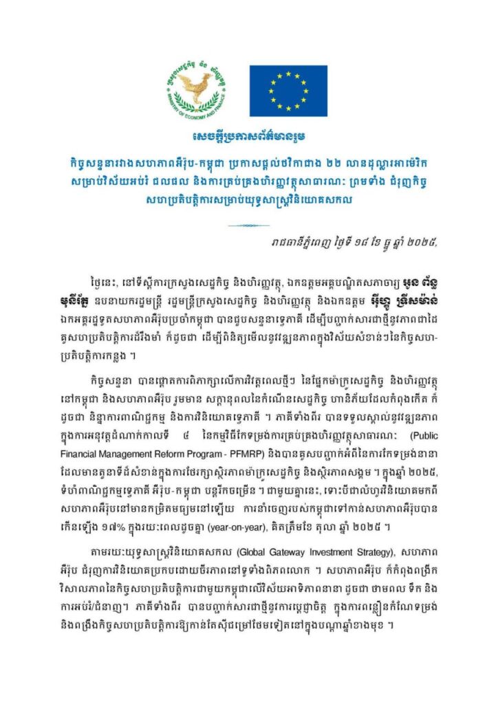ភ្នំពេញ ៖ ក្រសួងសេដ្ឋកិច្ច និងហិរញ្ញវត្ថុ និងសហភាពអ៉ឺរ៉ប បានចេញសេចក្តីប្រកាសព័ត៌មានរួម កិច្ចសន្ទនារវាងសហភាពអឺរ៉ុប-កម្ពុជា ប្រកាសផ្តល់ថវិកាជាង ២២ លានដុល្លារអាម៉េរិក សម្រាប់វិស័យអប់រំ ជលផល និងការគ្រប់គ្រងហិរញ្ញវត្ថុសាធារណៈ ព្រមទាំង ជំរុញកិច្ច សហប្រតិបត្តិការសម្រាប់យុទ្ធសាស្ត្រវិនិយោគសកល។