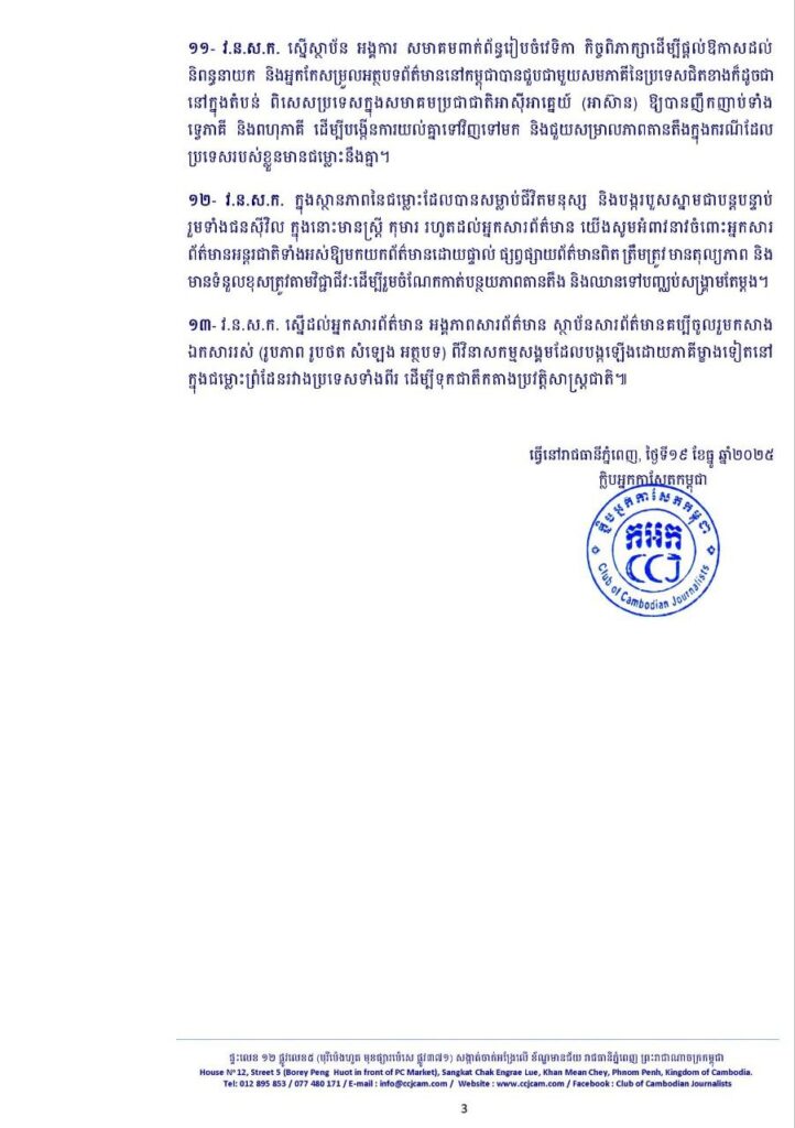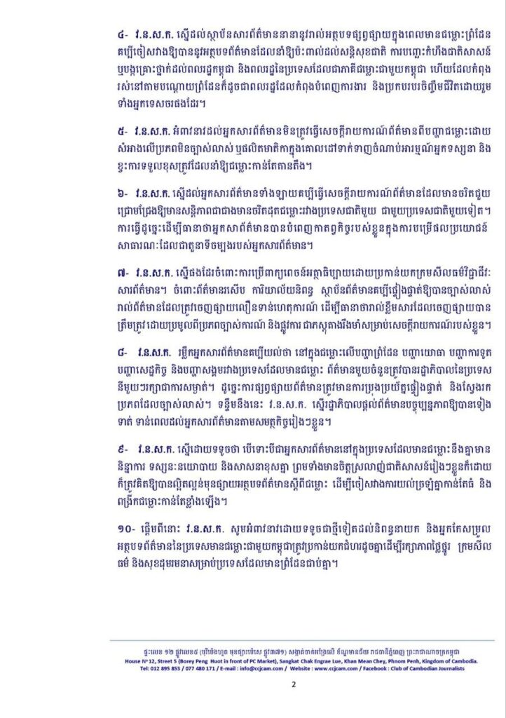 ១២- វ.ន.ស.ក. ក្នុងស្ថានភាពនៃជម្លោះដែលបានសម្លាប់ជីវិតមនុស្ស និងបង្ករបួសស្នាមជាបន្តបន្ទាប់ រួមទាំងជនស៊ីវិល ក្នុងនោះមានស្ត្រី កុមារ រហូតដល់អ្នកសារព័ត៌មាន យើងសូមអំពាវនាវចំពោះអ្នកសារ ព័ត៌មានអន្តរជាតិទាំងអស់ឱ្យមកយកព័ត៌មានដោយផ្ទាល់ ផ្សព្វផ្សាយព័ត៌មានពិត ត្រឹមត្រូវ មានតុល្យភាព និង មានទំនួលខុសត្រូវតាមវិជ្ជាជីវៈដើម្បីរួមចំណែកកាត់បន្ថយភាពតានតឹង និងឈានទៅបញ្ឈប់សង្គ្រាមតែម្តង។