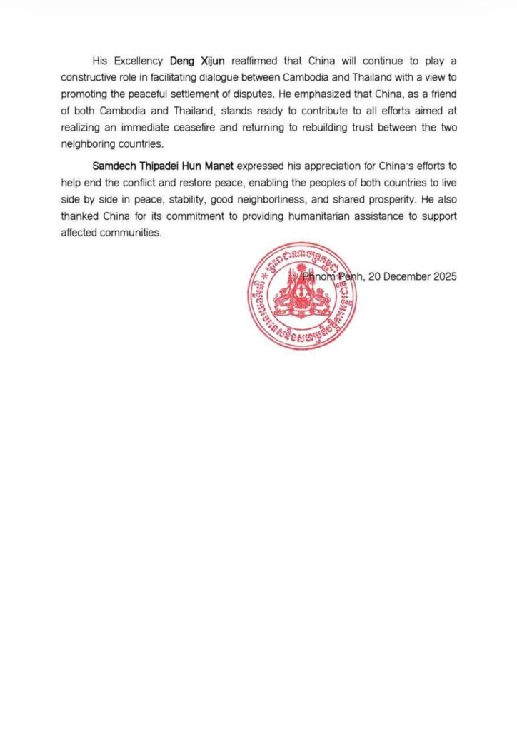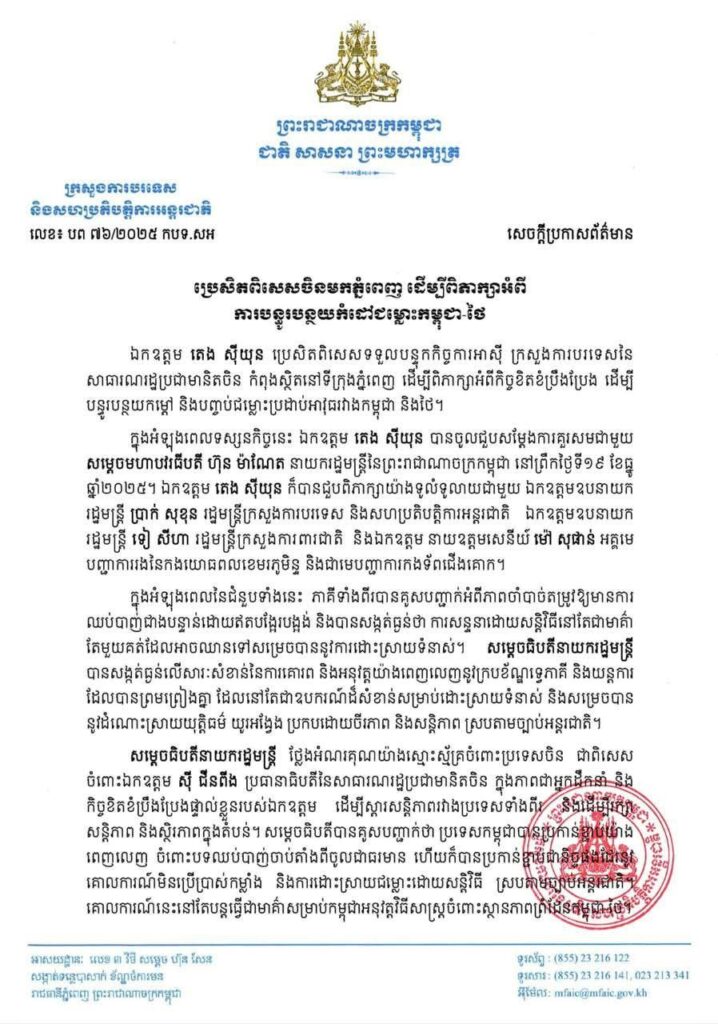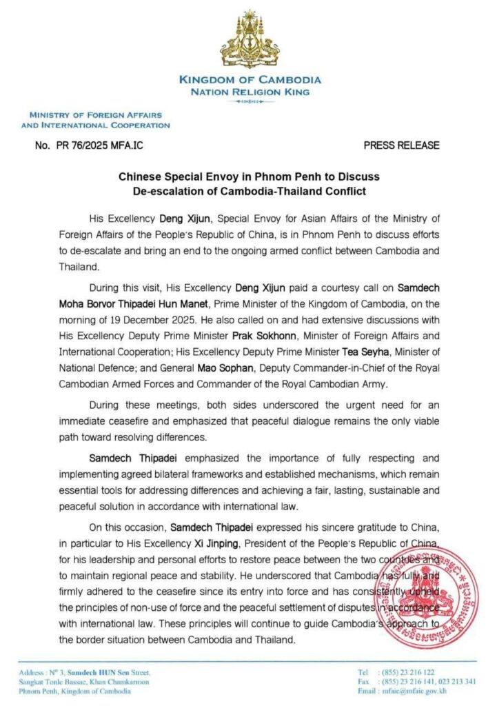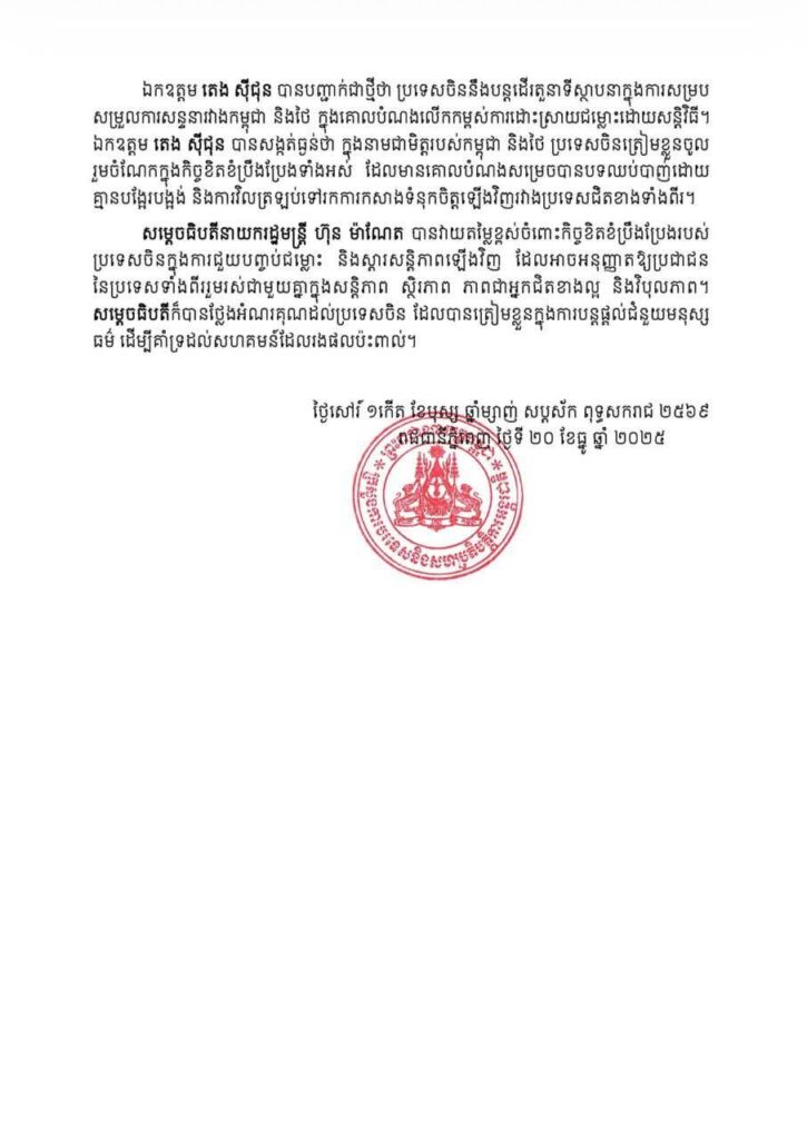 ភ្នំពេញ ៖ នៅរសៀលថ្ងៃទី១៩ ខែធ្នូ ឆ្នាំ២០២៥ ឯកឧត្តម ប្រាក់ សុខុន ឧបនាយករដ្ឋមន្ត្រី និងរដ្ឋមន្ត្រីការបរទេស និងសហប្រតិបត្តិការអន្តរជាតិនៃព្រះរាជាណាចក្រកម្ពុជា បានជួបពិភាក្សាជាមួយ ឯកឧត្តម តេង ស៊ីជុន ប្រេសិតពិសេសសម្រាប់កិច្ចការអាស៊ី នៃក្រសួងការបរទេសនៃសាធារណរដ្ឋប្រជាមានិតចិន៕ រក្សាសិទ្ធដោយ៖សុទ្ធលី