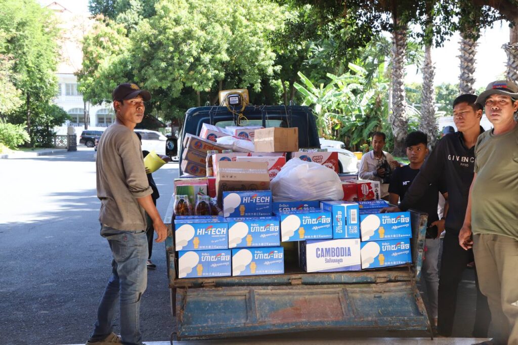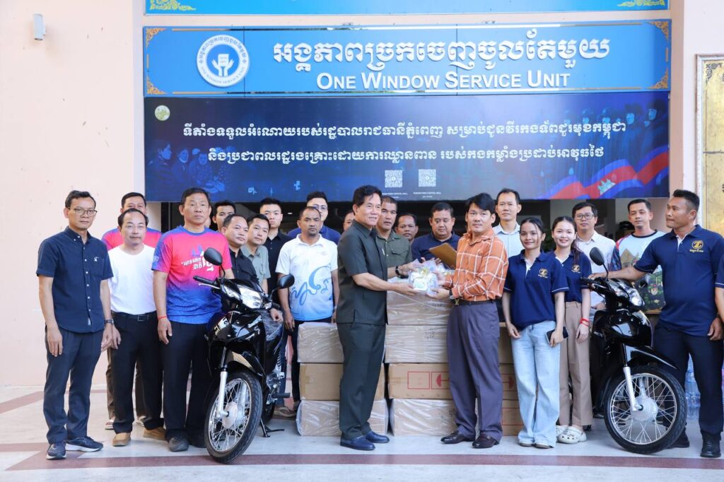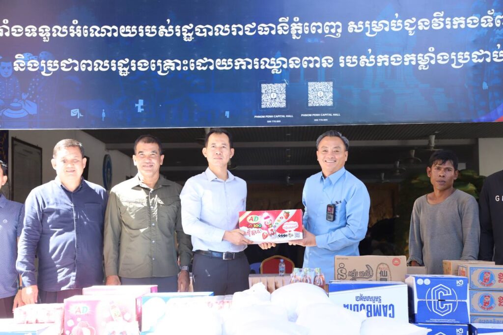 ភ្នំពេញ៖ថវិកា អង្ករ ម៉ូតូ និងគ្រឿងឧបភោគ បរិភោគមួយចំនួនត្រូវបានក្រុមហ៊ុនថោនគ្រុបនិងផែស្ងួត លី ធាម ប្រគល់ជូនរដ្ឋបាលរាជធានីភ្នំពេញ ដើម្បីយកទៅ ចែកជូនដល់វីរកងទ័ពជួរមុខ ដែលបាននឹងកំពុងខិតខំតស៊ូការពារបន្ទាត់ព្រំដែនកម្ពុជា-ថៃ ខណៈក្រុមទាហានថៃនៅតែបន្តឈ្លានពានលើបូរណៈភាពទឹកដីកម្ពុជាយ៉ាងគឃ្លើននោះ។ចំណែករដ្ឋបាលខណ្ឌព្រែកព្នៅមានថវិកាចំនួន៣០លានរៀលនិងសំភារៈស្បៀងអាហារគ្រប់ប្រភេទចំនួន៥ឡានបន្ថែមទៀត។