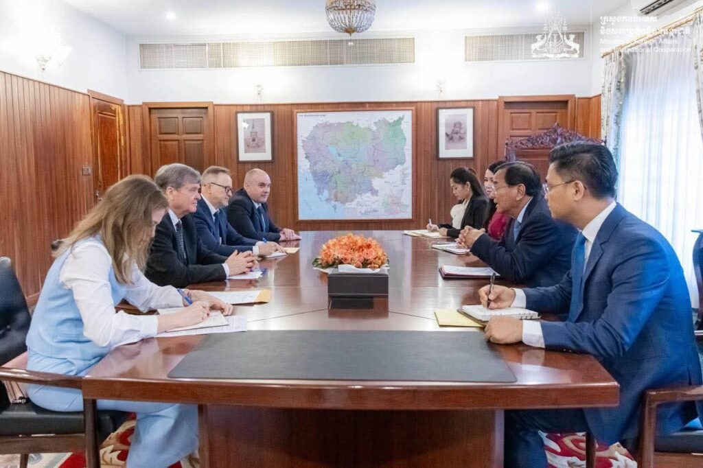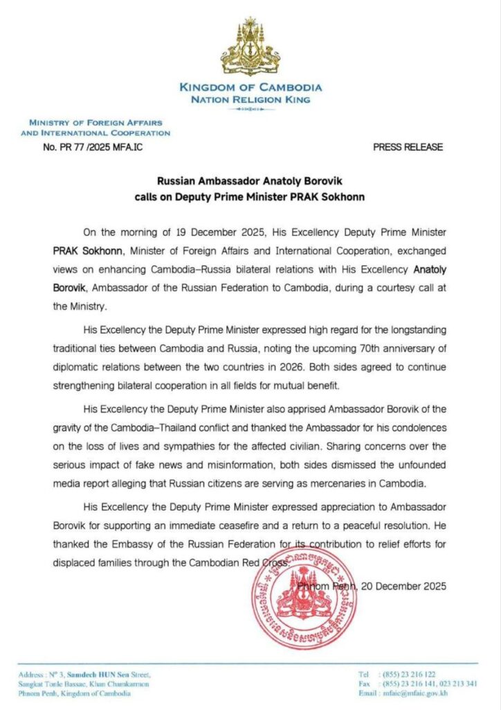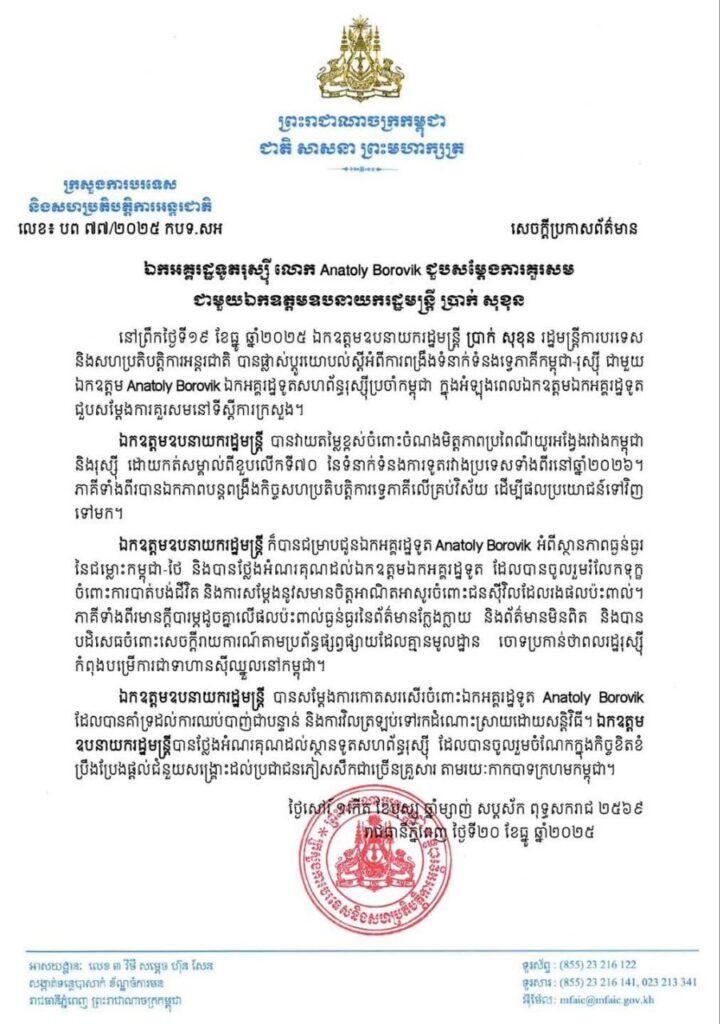 ភ្នំពេញ ៖ នៅព្រឹកថ្ងៃទី១៩ ខែធ្នូ ឆ្នាំ២០២៥ ឯកឧត្ដមឧបនាយករដ្ឋមន្ត្រី ប្រាក់ សុខុន រដ្ឋមន្ត្រីការបរទេស និងសហប្រតិបត្តិការអន្តរជាតិ បានផ្លាស់ប្តូរយោបល់ស្ដីអំពីការពង្រឹងទំនាក់ទំនងទ្វេភាគីកម្ពុជា-រុស្ស៊ី ជាមួយ ឯកឧត្តម Anatoly Borovik ឯកអគ្គរដ្ឋទូតសហព័ន្ធរុស្ស៊ីប្រចាំកម្ពុជា ក្នុងអំឡុងពេលឯកឧត្តមឯកអគ្គរដ្ឋទូត ជួបសម្ដែងការគួរសមនៅទីស្ដីការក្រសួង។