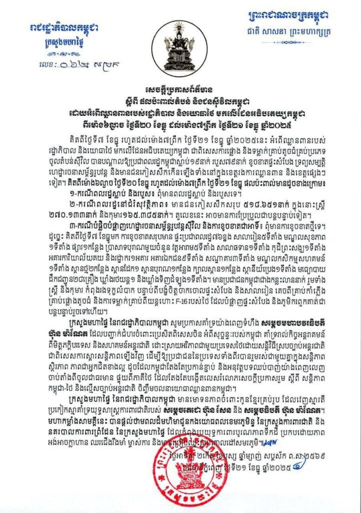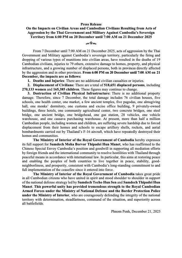 ភ្នំពេញ ៖ ក្រសួងមហាផ្ទៃ នៃរាជរដ្ឋាភិបាលកម្ពុជា ចេញសេចក្ដីប្រកាសព័ត៌មានស្ដីពី ផលប៉ះពាល់តំបន់ និងជនស៊ីវិលកម្ពុជា ដោយអំពើឈ្លានពានរបស់រដ្ឋាភិបាល និងយោធាថៃ មកលើដែនអធិបតេយ្យកម្ពុជា ពីម៉ោង៦ល្ងាច ថ្ងៃទី២០ ខែធ្នូ ដល់ម៉ោង៧ព្រឹក ថ្ងៃទី២១ ខែធ្នូ ឆ្នាំ២០២៥៕ រក្សាសិទ្ធដោយ៖សុទ្ធលី