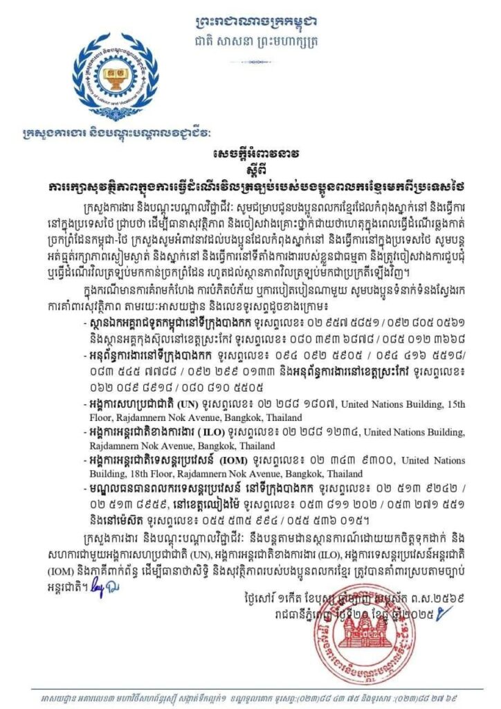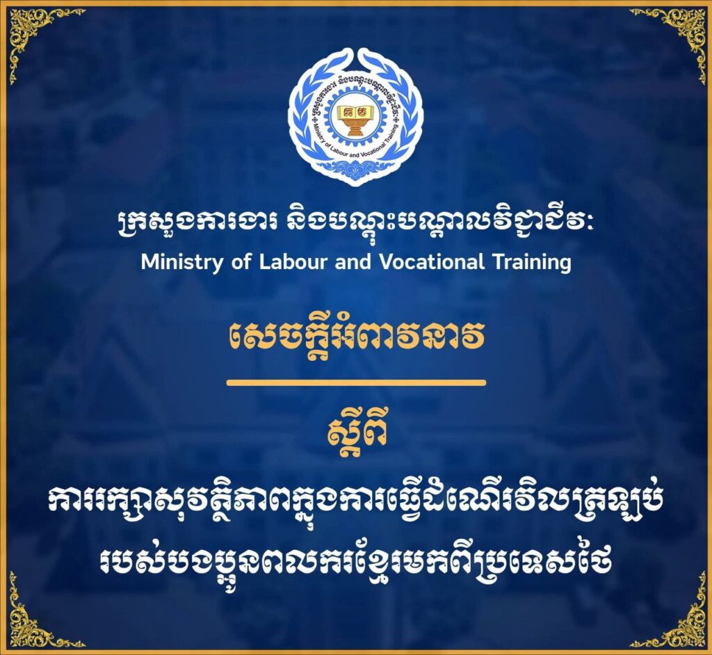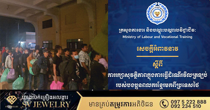 ភ្នំពេញ ៖ ក្រសួងការងារ និងបណ្តុះបណ្តាលវិជ្ជាជីវៈ សូមជម្រាបជូនបងប្អូនពលករខ្មែរដែលកំពុងស្នាក់នៅ និងធ្វើការ នៅក្នុងប្រទេសថៃ ជ្រាបថា ដើម្បីធានាសុវត្ថិភាព និងចៀសវាងគ្រោះថ្នាក់ជាយថាហេតុក្នុងពេលធ្វើដំណើរឆ្លងកាត់ ច្រកព្រំដែនកម្ពុជា-ថៃ ក្រសួងសូមអំពាវនាវដល់បងប្អូនដែលកំពុងស្នាក់នៅ និងធ្វើការនៅក្នុងប្រទេសថៃ សូមបន្ត និងត្រូវចៀសវាងការជួបជុំ អត់ធ្មត់រក្សាភាពស្ងៀមស្ងាត់ និងស្នាក់នៅ និងធ្វើការនៅទីតាំងការងាររបស់ខ្លួនជាធម្មតា ឬធ្វើដំណើរវិលត្រឡប់មកកាន់ច្រកព្រំដែន រហូតដល់ស្ថានភាពវិលត្រឡប់មកជាប្រក្រតីឡើងវិញ។