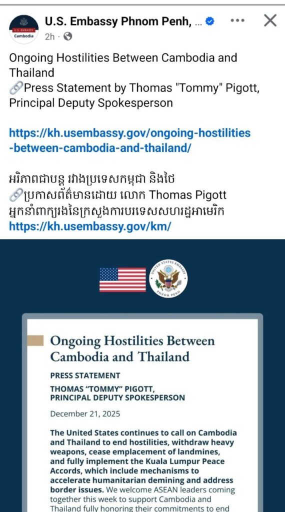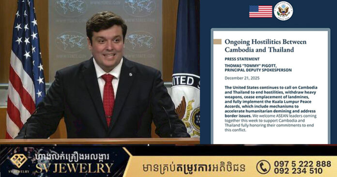 លោក Thomas Pigott អ្នកនាំពាក្យរងនៃក្រសួងការបរទេសសហរដ្ឋអាមេរិក នៅថ្ងៃទី ២១ ខែធ្នូ ឆ្នាំ ២០២៥ បានចេញប្រកាសព័ត៌មានឲ្យដឹងថា សហរដ្ឋអាមេរិកបន្តអំពាវនាវឲ្យប្រទេសកម្ពុជា និងប្រទេសថៃបញ្ចប់អរិភាពនឹងគ្នា ដកយុទ្ធភណ្ឌធ្ងន់ៗ ឈប់ដាក់គ្រាប់មីន និងអនុវត្តកិច្ចព្រមព្រៀងសន្តិភាពទីក្រុង Kuala Lumpur យ៉ាងពេញលេញ ដែលរួមមានយន្តការពន្លឿនការដោះមីនមនុស្សធម៌ និងការដោះស្រាយបញ្ហាព្រំដែន។ យើងសូមស្វាគមន៍មេដឹកនាំអាស៊ានមកប្រជុំគ្នា នៅសប្តាហ៍នេះ ដើម្បីគាំទ្រឲ្យកម្ពុជា និងថៃគោរពការប្តេជ្ញាចិត្តរបស់ខ្លួនយ៉ាងពេញលេញ ដើម្បីបញ្ចប់ជម្លោះនេះ៕ រក្សាសិទ្ធដោយ៖សុទ្ធលី
