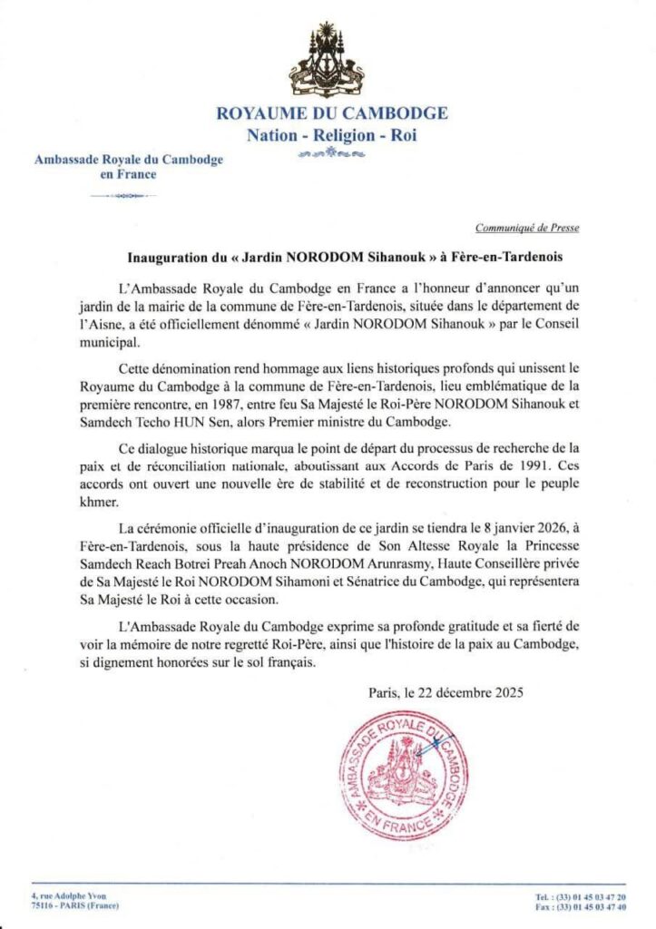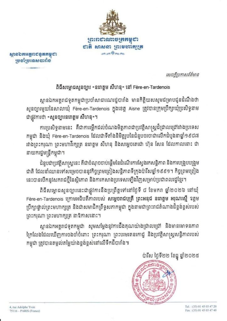 នៅថ្ងៃទី២២ ខែធ្នូ ឆ្នាំ២០២៥ស្ថានឯកអគ្គរាជទូតកម្ពុជា ប្រចាំប្រទេសបារាំង បានចេញសេចក្តីប្រកាសព័ត៌មាន ពិធីសម្ពោធសួនច្បារ «នរោត្តម សីហនុ នៅ Fère-en-Tardenois។