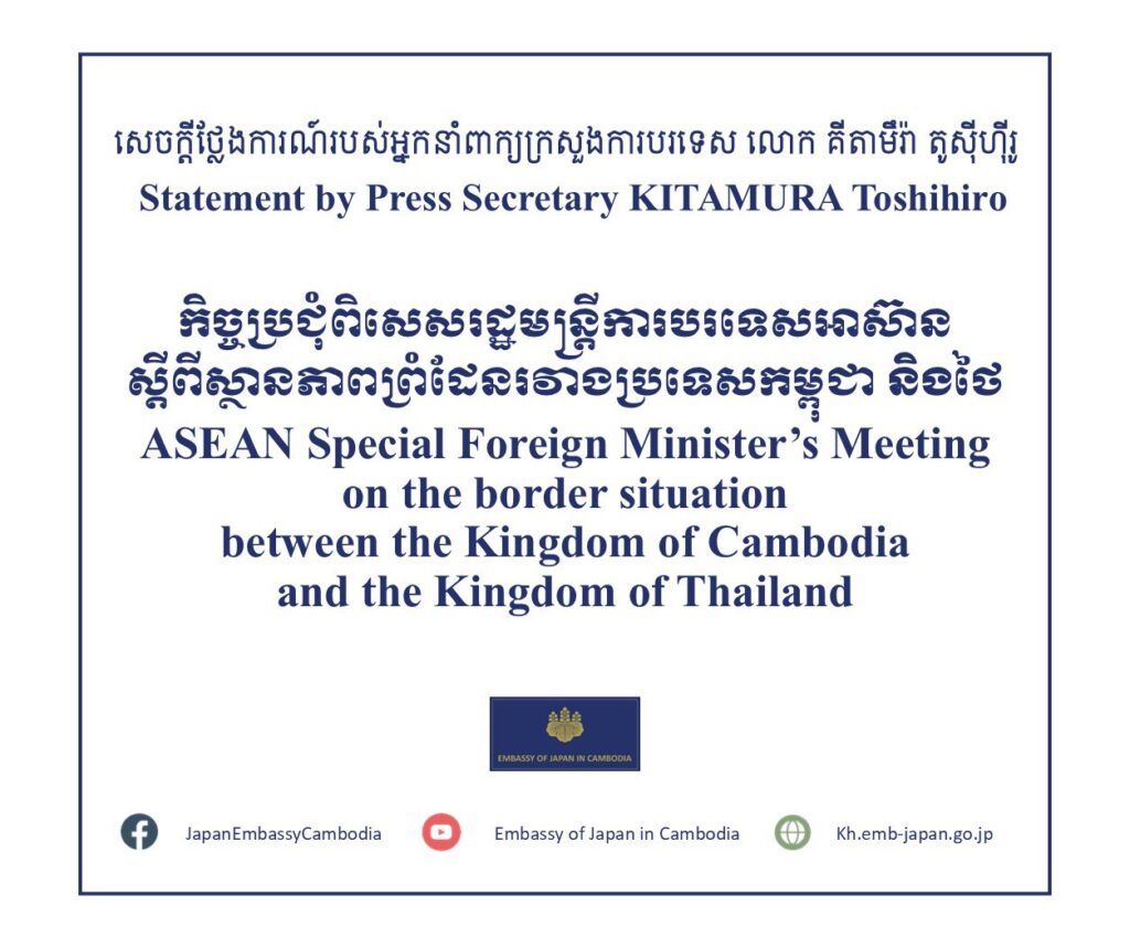 ២. ក្នុងស្ថានភាពនេះ កិច្ចប្រជុំពិសេសរដ្ឋមន្ត្រីការបរទេសអាស៊ានត្រូវបានធ្វើឡើងនៅទីក្រុងគូឡាឡាំពួរ ប្រទេសម៉ាឡេស៊ី នៅថ្ងៃទី២២ ខែធ្នូ ហើយសេចក្តីថ្លែងការណ៍របស់ប្រធានអាស៊ានត្រូវបានចេញផ្សាយដោយជំរុញឱ្យប្រទេសទាំងពីរចាត់វិធានការជាបន្ទាន់ដើម្បីបញ្ឈប់អំពើអរិភាព និងវិលត្រឡប់ទៅរកការសន្ទនាវិញ។ ប្រទេសជប៉ុនសូមសម្តែងការគោរពយ៉ាងជ្រាលជ្រៅ ចំពោះកិច្ចខិតខំប្រឹងប្រែងផ្នែកការទូតរបស់ប្រទេសម៉ាឡេស៊ីដែលជាប្រធានអាស៊ាន និងស្វាគមន៍ចំពោះជំហានវិជ្ជមាន ឆ្ពោះទៅរកការបន្ធូរបន្ថយភាពតានតឹង។ ជប៉ុនក៏សម្តែងការគោរពយ៉ាងជ្រាលជ្រៅសារជាថ្មីម្តងទៀតចំពោះសហរដ្ឋអាម៉េរិក ដែលបានខិតខំប្រឹងប្រែងដើម្បីសម្រេចបាននូវសន្តិភាព ក្នុងនោះមានកិច្ចព្រមព្រៀងបទឈប់បាញ់ និងសេចក្តីថ្លែងការណ៍រួមនៅទីក្រុងគូឡាឡាំពួរ។
