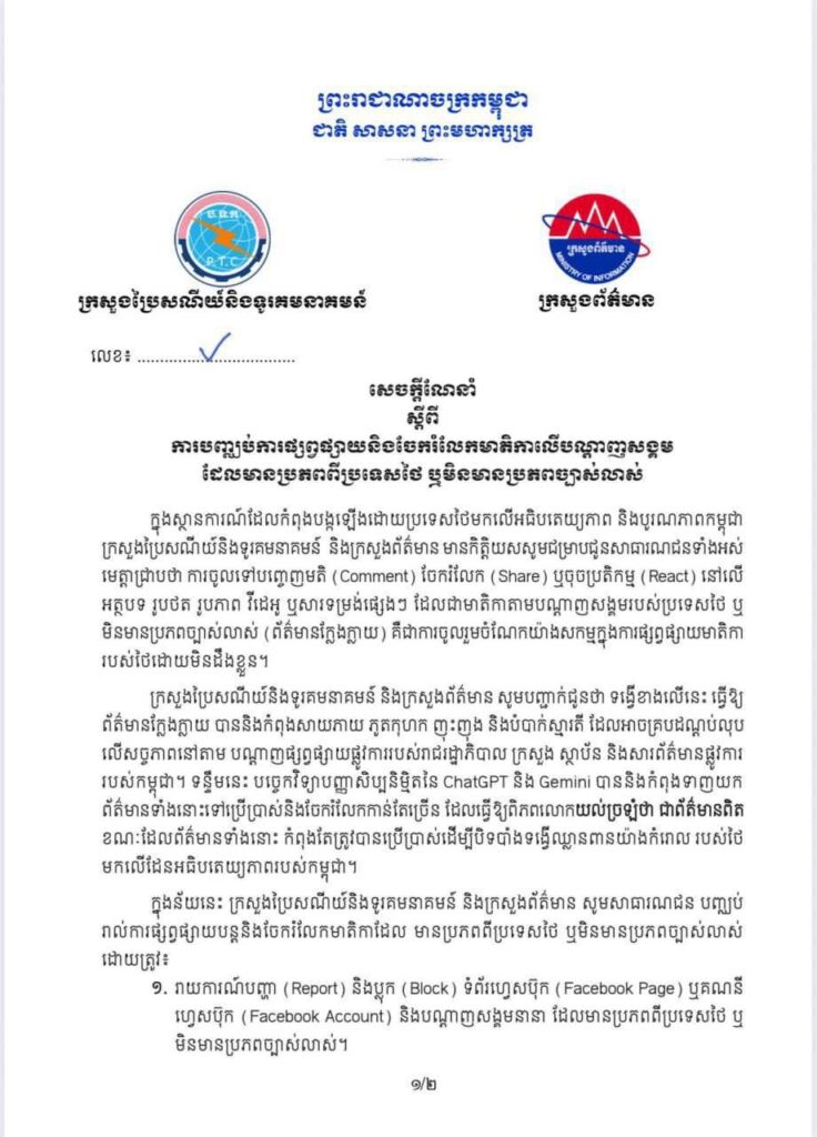 ក្នុងន័យនេះ ក្រសួងប្រៃសណីយ៍និងទូរគមនាគមន៍ និងក្រសួងព័ត៌មាន សូមសាធារណជន បញ្ឈប់ រាល់ការផ្សព្វផ្សាយបន្តនិងចែករំលែកមាតិកាដែល មានប្រភពពីប្រទេសថៃ ឬមិនមានប្រភពច្បាស់លាស់ដោយត្រូវ៖