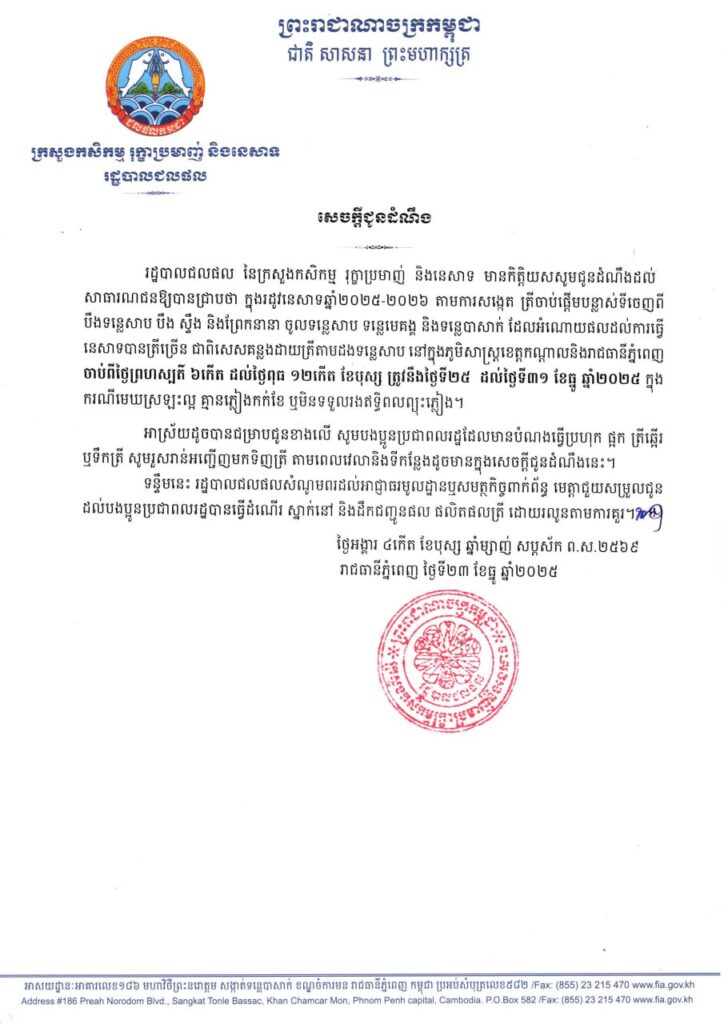 ភ្នំពេញ ៖ រដ្ឋបាលជលផល នៃក្រសួងកសិកម្ម រុក្ខាប្រមាញ់ និងនេសាទ សូមជូនដំណឹងដល់ សាធារណជនឱ្យបានជ្រាបថា ក្នុងរដូវនេសាទឆ្នាំ២០២៥-២០២៦ តាមការសង្កេត ត្រីចាប់ផ្តើមបន្លាស់ទីចេញពី បឹងទន្លេសាប បឹង ស្ទឹង និងព្រែកនានា ចូលទន្លេសាប ទន្លេមេគង្គ និងទន្លេបាសាក់ ដែលអំណោយផលដល់ការធ្វើ នេសាទបានត្រីច្រើន ជាពិសេសគន្លងដាយត្រីតាមដងទន្លេសាប នៅក្នុងភូមិសាស្ត្រខេត្តកណ្តាលនិងរាជធានីភ្នំពេញ ចាប់ពីថ្ងៃព្រហស្បតិ៍ ៦កើត ដល់ថ្ងៃពុធ ១២កើត ខែបុស្ស ត្រូវនឹងថ្ងៃទី២៥ ដល់ថ្ងៃទី៣១ ខែធ្នូ ឆ្នាំ២០២៥ ក្នុង ករណីមេឃស្រឡះល្អ គ្មានភ្លៀងកក់ខែ ឬមិនទទួលរងឥទ្ធិពលព្យុះភ្លៀង។