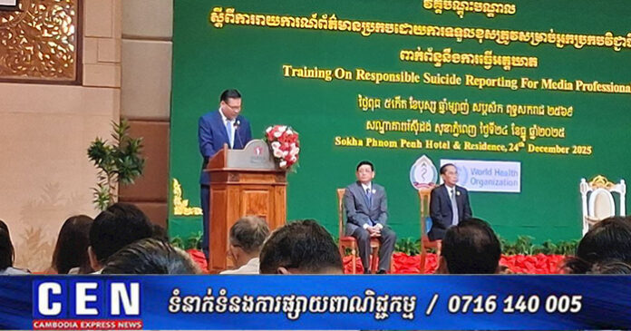 ភ្នំពេញ ៖ ឯកឧត្តមឱសថការី ឈី ហុង រដ្ឋលេខាធិការក្រសួងសុខាភិបាល បានថ្លែងថា នៅកម្ពុជា អត្តឃាតនៅតែជាបញ្ហាដ៏រសើប និងតម្រូវឱ្យមានការយកចិត្តទុកដាក់ខ្ពស់ ជាពិសេសក្នុងបរិបទនៃការផ្សព្វផ្សាយព័ត៌មាន ការបណ្តុះបណ្តាលជាក់លាក់ដល់អ្នកប្រកបវិជ្ជាជីវសារព័ត៌មានអំពីរបៀប រាយការណ៍ប្រកបដោយក្រមសីលធម៌ ការទទួលខុសត្រូវខ្ពស់នៃករណ៏ធ្វើអត្តឃាត និងសុវត្ថិភាព គឺជាតម្រូវ ការចាំបាច់។