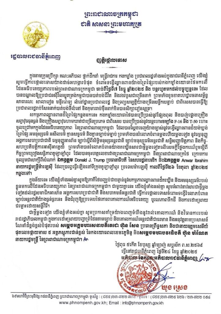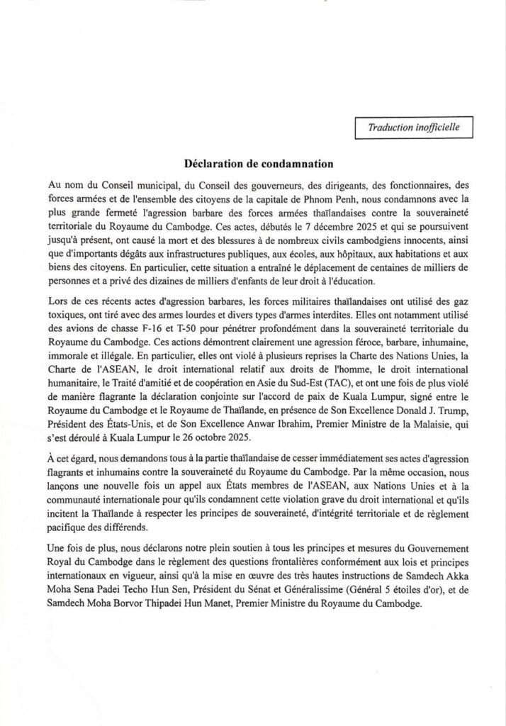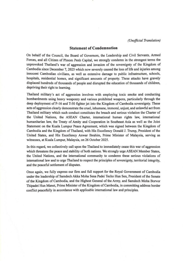 ភ្នំពេញ ៖ រដ្ឋបាលរាជធានីភ្នំពេញ ចេញញត្តិថ្កោលទោស យ៉ាងដាច់អហង្ការបំផុត ចំពោះទង្វើឈ្លានពានយ៉ាងព្រៃផ្សៃរបស់កងកម្លាំងយោធាថៃ មកលើដែនអធិបតេយ្យភាពរបស់ព្រះរាជាណាចក្រកម្ពុជា ចាប់ពីថ្ងៃទី០៧ ខែធ្នូ ឆ្នាំ២០២៥ និងបន្តរហូតមកដល់បច្ចុប្បន្ននេះ ដែលបណ្តាលឱ្យប្រជាជនស៊ីវិលស្លូតត្រង់កម្ពុជាបានបាត់បង់ជីវិត និងរងរបួសជាច្រើននាក់ ព្រមទាំងខូចខាតហេដ្ឋារចនាសម្ព័ន្ធ សាធារណៈ សាលារៀន មន្ទីរពេទ្យ លំនៅដ្ឋានប្រជាពលរដ្ឋ និងទ្រព្យសម្បត្តិយ៉ាងច្រើនសន្ធឹកសន្ធាប់ ជាពិសេសបានធ្វើឱ្យប្រជាពលរដ្ឋរាប់សែននាក់បាត់បង់ទីលំនៅ និងកុមាររាប់ម៉ឺននាក់មិនបានសិក្សារៀនសូត្រ៕រក្សាសិទ្ធដោយ៖សុទ្ធលី