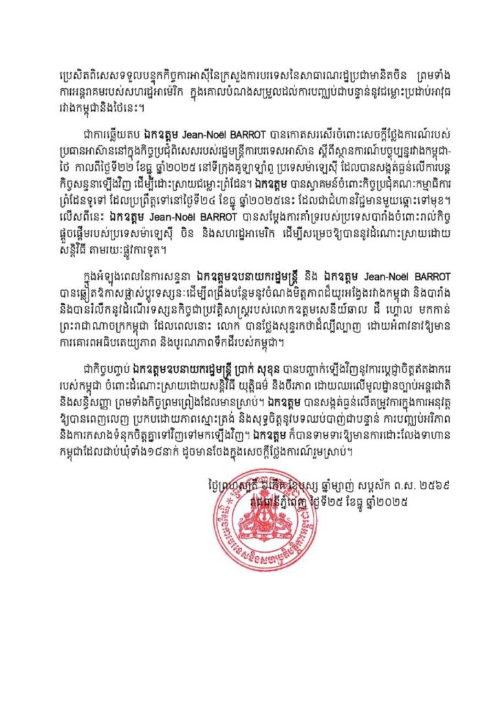 ជាការឆ្លើយតប ឯកឧត្តម Jean-Noël BARROT បានកោតសរសើរចំពោះសេចក្តីថ្លែងការណ៍របស់ ប្រធានអាស៊ាននៅក្នុងកិច្ចប្រជុំពិសេសរបស់រដ្ឋមន្ត្រីការបរទេសអាស៊ាន ស្តីពីស្ថានការណ៍បច្ចុប្បន្នរវាងកម្ពុជា- ថៃ កាលពីថ្ងៃទី២២ ខែធ្នូ ឆ្នាំ២០២៥ នៅទីក្រុងគូឡាឡាំពួ ប្រទេសម៉ាឡេស៊ី ដែលបានសង្កត់ធ្ងន់លើការបន្ត កិច្ចសន្ទនាឡើងវិញ ដើម្បីដោះស្រាយជម្លោះព្រំដែន។ ឯកឧត្តម បានស្វាគមន៍ចំពោះកិច្ចប្រជុំគណៈកម្មាធិការ ព្រំដែនទូទៅ ដែលប្រព្រឹត្តទៅនៅថ្ងៃទី២៤ ខែធ្នូ ឆ្នាំ២០២៥នេះ ដែលជាជំហានវិជ្ជមានមួយឆ្ពោះទៅមុខ។ លើសពីនេះ ឯកឧត្តម Jean-Noël BARROT បានសម្តែងការគាំទ្ររបស់ប្រទេសបារាំងចំពោះរាល់កិច្ច ផ្តួចផ្តើមរបស់ប្រទេសម៉ាឡេស៊ី ចិន និងសហរដ្ឋអាមេរិក ដើម្បីសម្រេចឱ្យបាននូវដំណោះស្រាយដោយ សន្តិវិធី តាមរយៈផ្លូវការទូត។