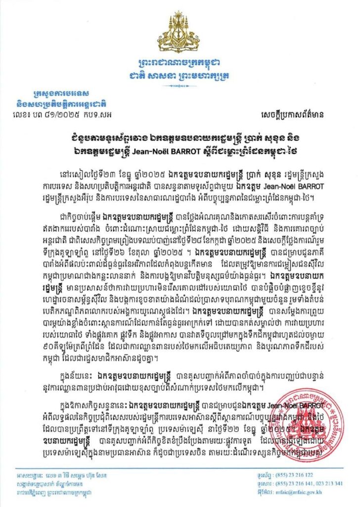 ភ្នំពេញ ៖ នៅរសៀលថ្ងៃទី២៣ ខែធ្នូ ឆ្នាំ២០២៥ ឯកឧត្ដមឧបនាយករដ្ឋមន្ត្រី ប្រាក់ សុខុន រដ្ឋមន្ត្រីក្រសួង ការបរទេស និងសហប្រតិបត្តិការអន្តរជាតិ បានសន្ទនាតាមទូរស័ព្ទជាមួយ ឯកឧត្តម Jean-Noël BARROT រដ្ឋមន្ត្រីក្រសួងអឺរ៉ុប និងការបរទេសនៃសាធារណរដ្ឋបារាំង អំពីបច្ចុប្បន្នភាពនៃជម្លោះព្រំដែនកម្ពុជា-ថៃ។