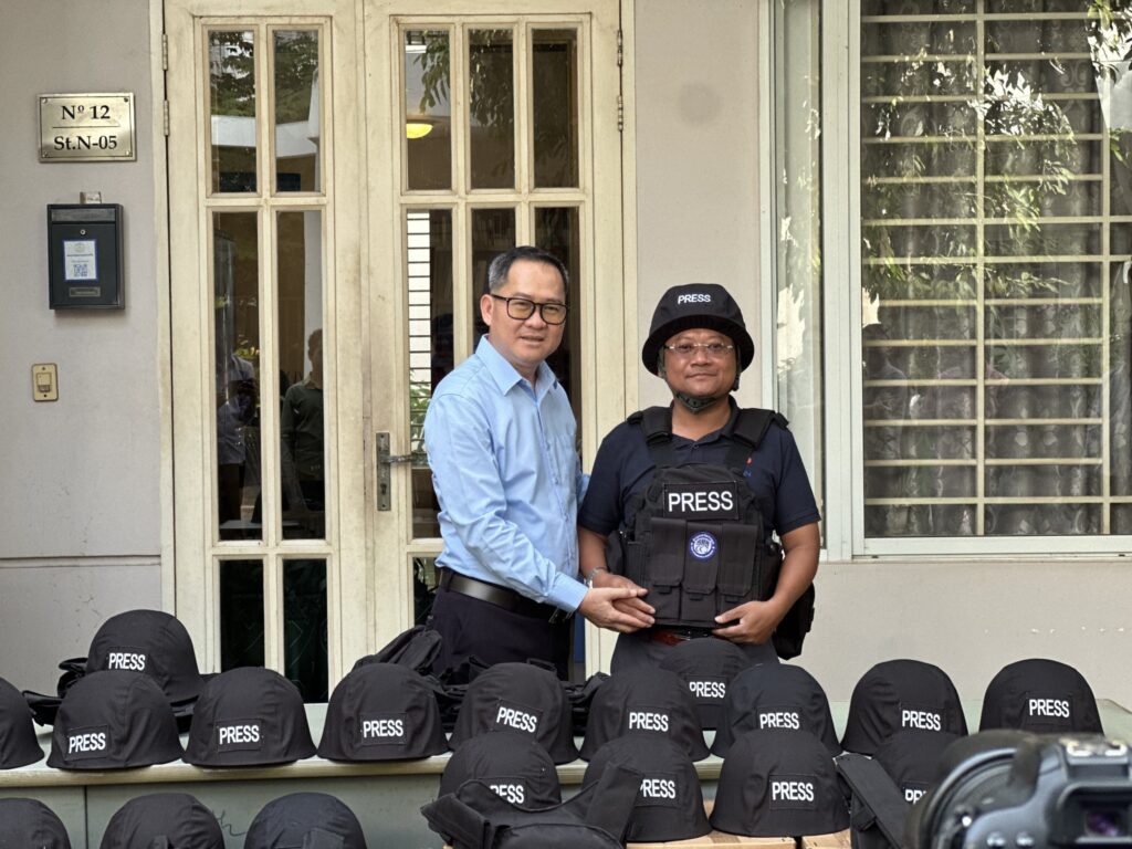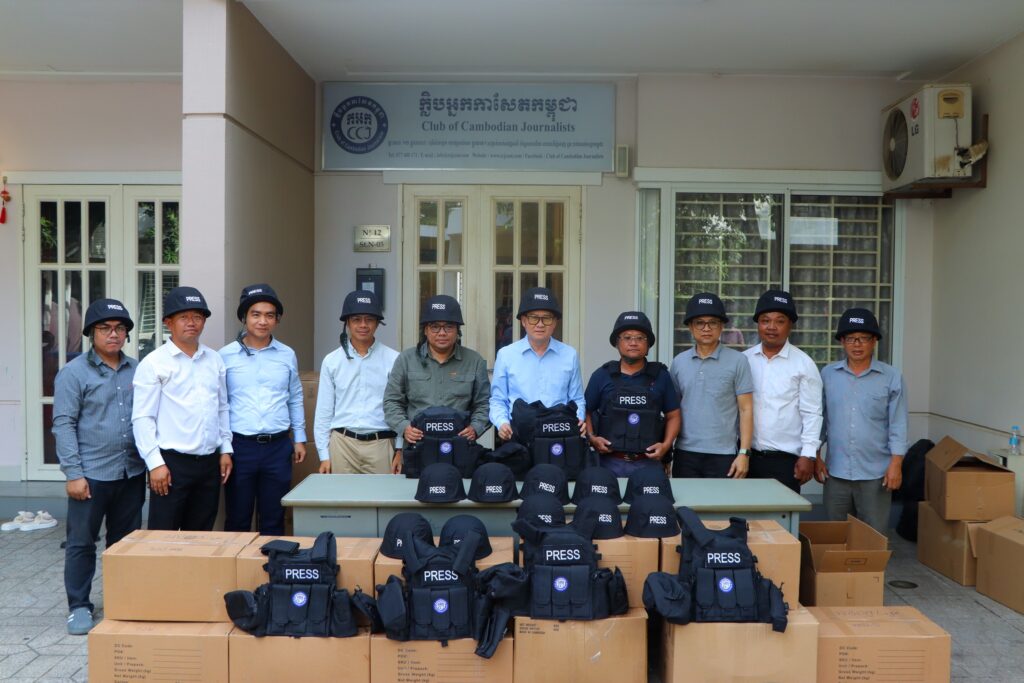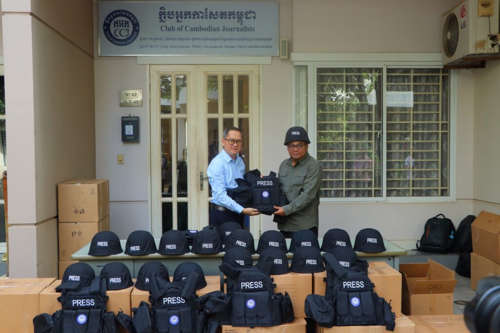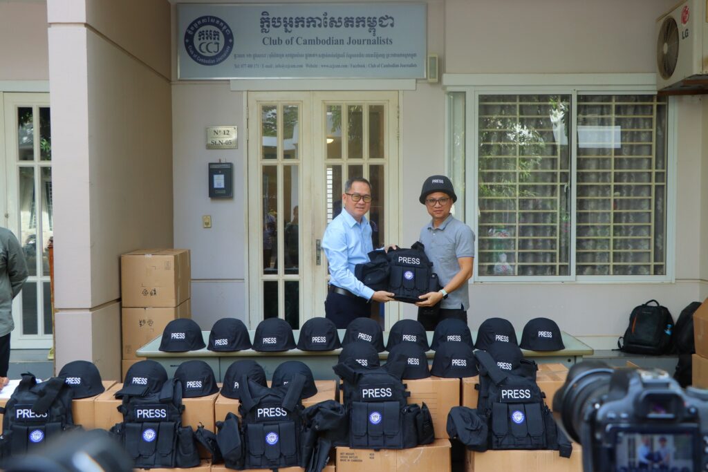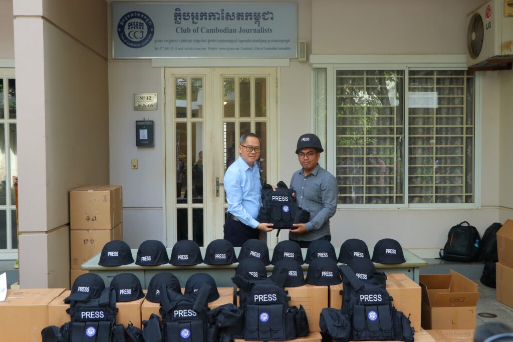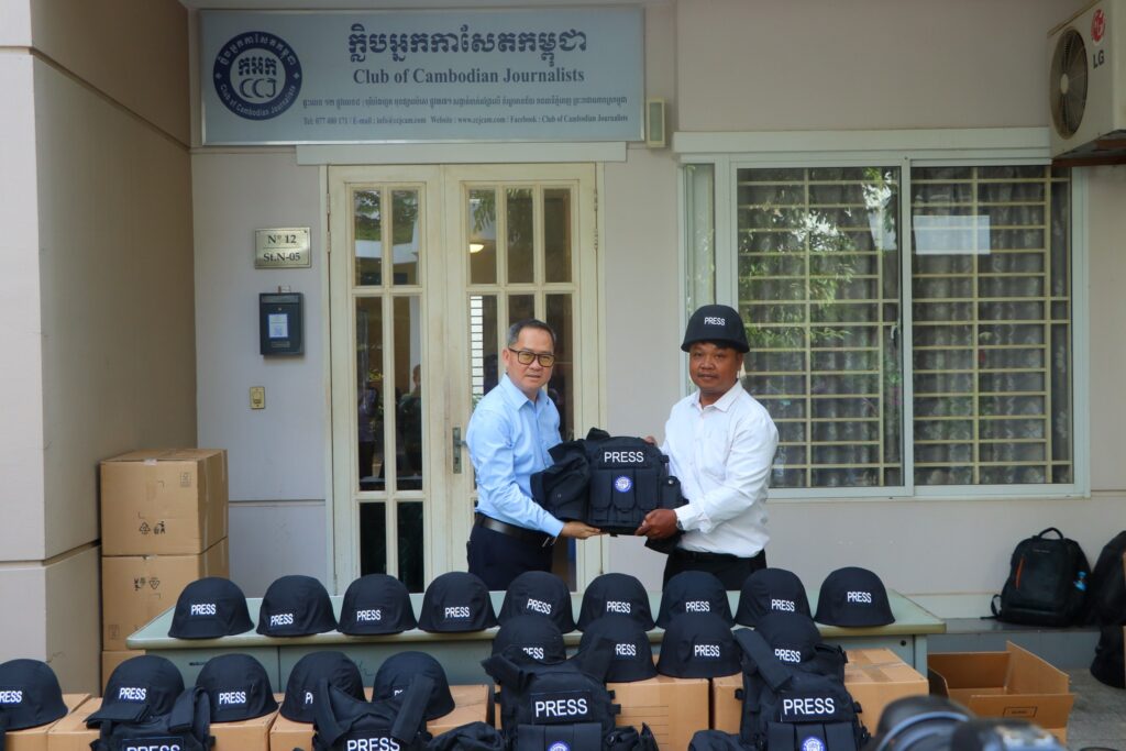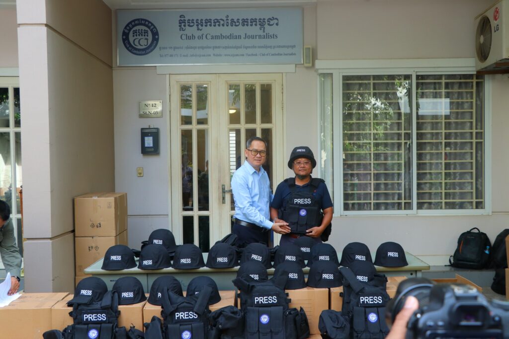 ភ្នំពេញ ៖ ក្លិបអ្នកកាសែតកម្ពុជា (ក.អ.ក) នៅថ្ងៃទី២៦ ខែធ្នូ ឆ្នាំ២០២៥ បានចែកអាវក្រោះ និងមួកសុវត្ថិភាព ដល់អ្នកសារព័ត៌មានចំនួន៥៧រូប មកពី៣៦ស្ថាប័ន ដើម្បីជួយការពារសុវត្ថិភាពដល់អ្នកសារព័ត៌មានដែល កំពុងបំពេញការងារព័ត៌មាននៅតាមបណ្ដោយព្រំដែនកម្ពុជា-ថៃ និងទីកន្លែងងាយរងគ្រោះដទៃទៀតក្នុងអំឡុង ពេលដែលទាហានថៃបានវាយប្រហារមកលើកម្ពុជា។