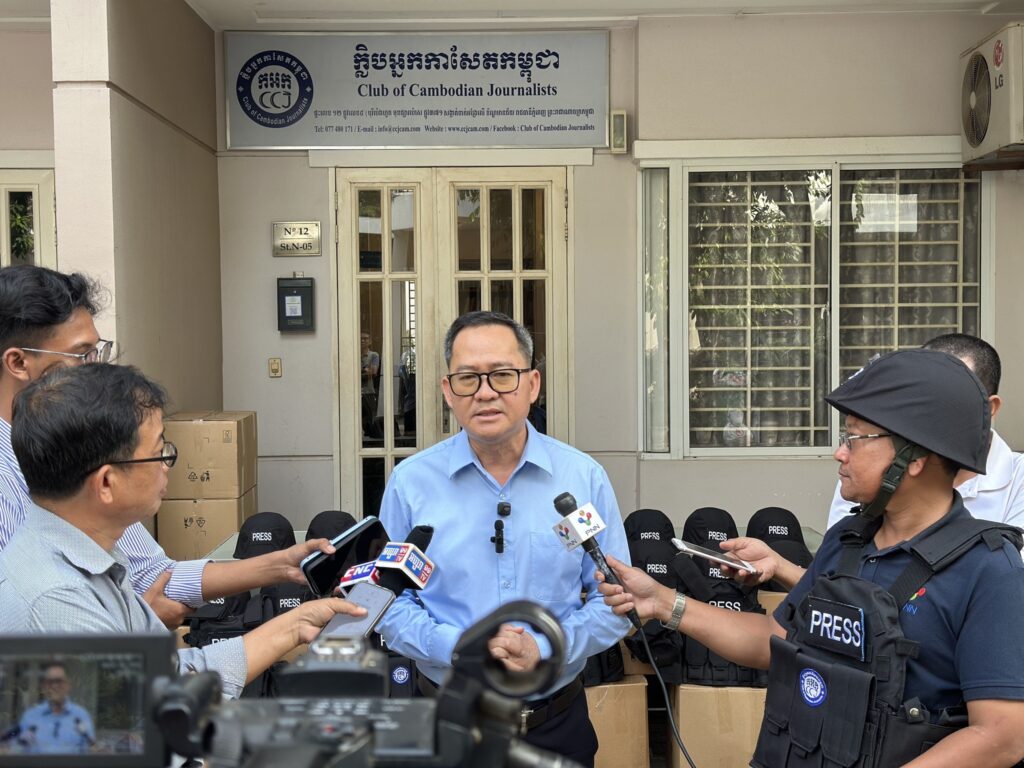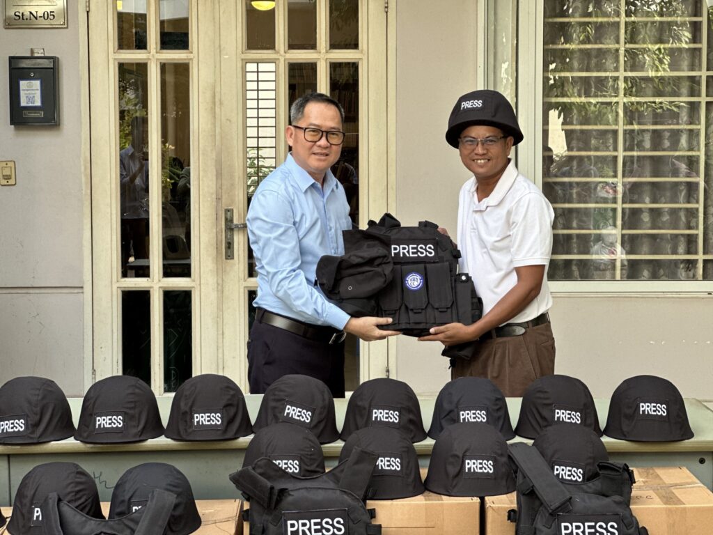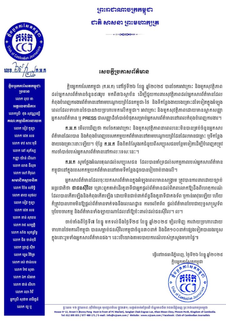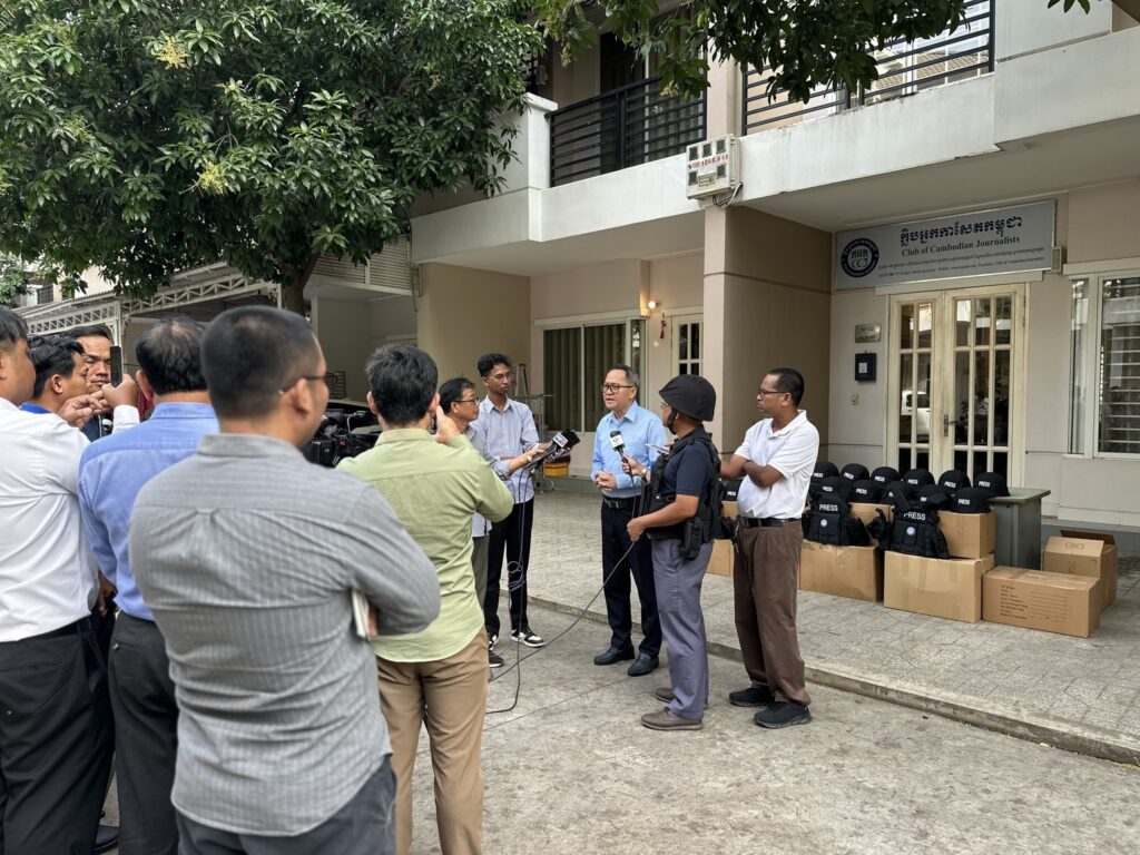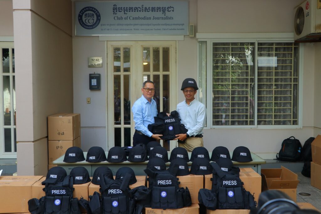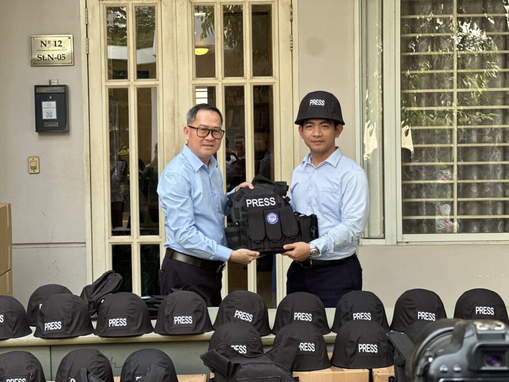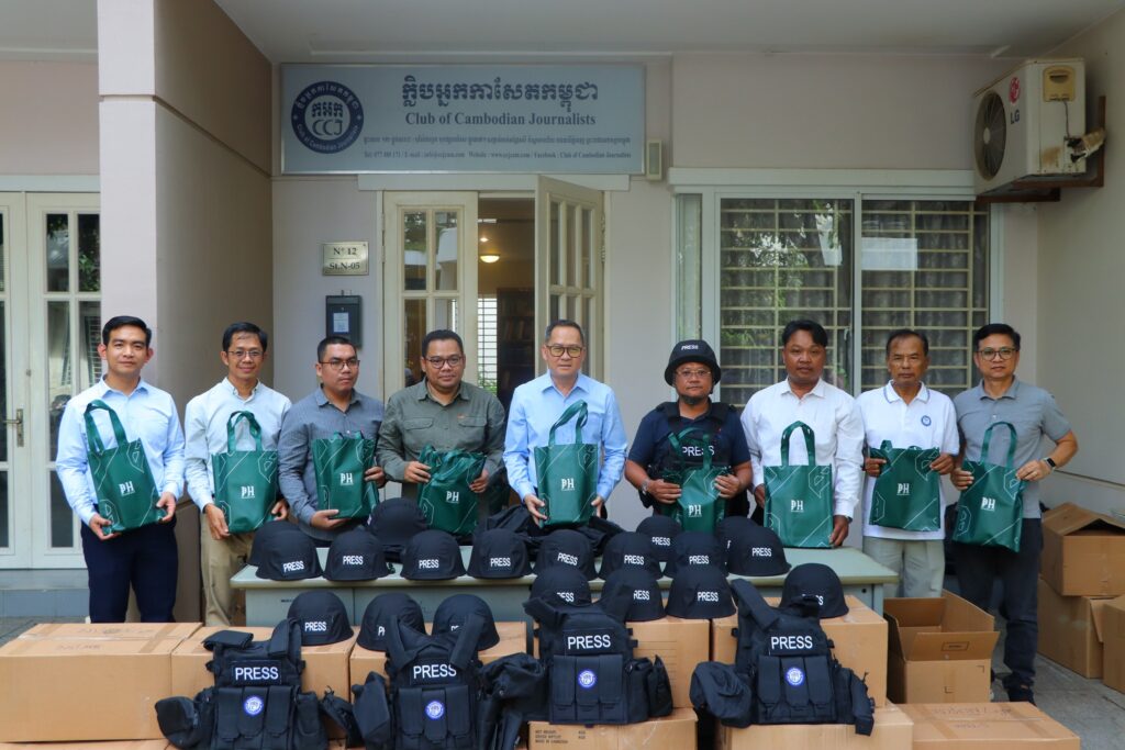 ភ្នំពេញ ៖ ក្លិបអ្នកកាសែតកម្ពុជា (ក.អ.ក) នៅថ្ងៃទី២៦ ខែធ្នូ ឆ្នាំ២០២៥ បានចែកអាវក្រោះ និងមួកសុវត្ថិភាព ដល់អ្នកសារព័ត៌មានចំនួន៥៧រូប មកពី៣៦ស្ថាប័ន ដើម្បីជួយការពារសុវត្ថិភាពដល់អ្នកសារព័ត៌មានដែល កំពុងបំពេញការងារព័ត៌មាននៅតាមបណ្ដោយព្រំដែនកម្ពុជា-ថៃ និងទីកន្លែងងាយរងគ្រោះដទៃទៀតក្នុងអំឡុង ពេលដែលទាហានថៃបានវាយប្រហារមកលើកម្ពុជា។