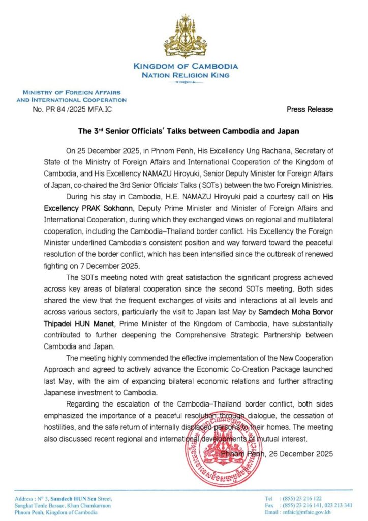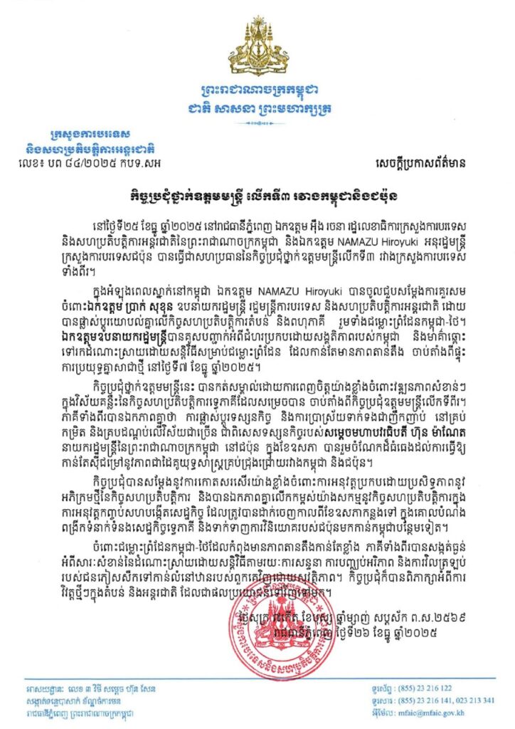 ភ្នំពេញ៖ នៅថ្ងៃទី២៥ ខែធ្នូ ឆ្នាំ២០២៥ នៅរាជធានីភ្នំពេញ ឯកឧត្តម អ៊ឹង រចនា រដ្ឋលេខាធិការក្រសួងការបរទេស និងសហប្រតិបត្តិការអន្តរជាតិនៃព្រះរាជាណាចក្រកម្ពុជា និងឯកឧត្តម NAMAZU Hiroyuki អនុរដ្ឋមន្ត្រី ក្រសួងការបរទេសជប៉ុន បានធ្វើជាសហប្រធាននៃកិច្ចប្រជុំថ្នាក់ឧត្តមមន្ត្រីលើកទី៣ រវាងក្រសួងការបរទេសទាំងពីរ។