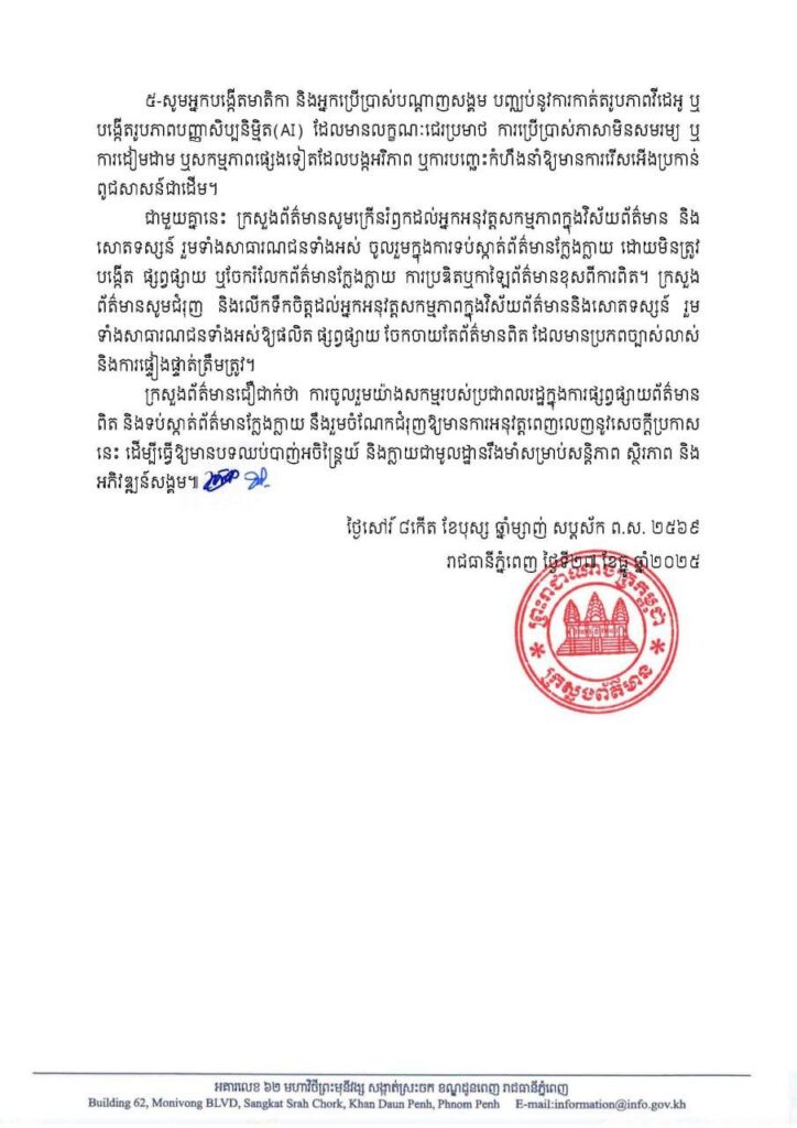 ដោយមិនត្រូវ ជាមួយគ្នានេះ ក្រសួងព័ត៌មានសូមក្រើនរំឭកដល់អ្នកអនុវត្តសកម្មភាពក្នុងវិស័យព័ត៌មាន និង សោតទស្សន៍ រួមទាំងសាធារណជនទាំងអស់ ចូលរួមក្នុងការទប់ស្កាត់ព័ត៌មានក្លែងក្លាយ បង្កើត ផ្សព្វផ្សាយ ឬចែករំលែកព័ត៌មានក្លែងក្លាយ ការប្រឌិតឬកាឡៃព័ត៌មានខុសពីការពិត។ ក្រសួង ព័ត៌មានសូមជំរុញ និងលើកទឹកចិត្តដល់អ្នកអនុវត្តសកម្មភាពក្នុងវិស័យព័ត៌មាននិងសោតទ រួម ទាំងសាធារណជនទាំងអស់ឱ្យផលិត ផ្សព្វផ្សាយ ចែកចាយតែព័ត៌មានពិត ដែលមានប្រភពច្បាស់លាស់ និងការផ្ទៀងផ្ទាត់ត្រឹមត្រូវ។
