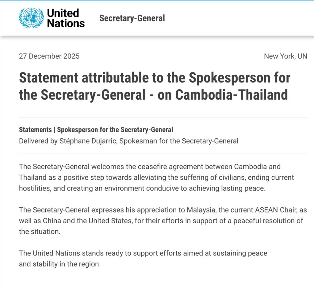 លោក Stéphane Dujarric អ្នកនាំពាក្យរបស់អគ្គលេខាធិការអង្គការសហប្រជាជាតិ បានចេញសេចក្តីថ្លែងការណ៍ ចេញពីទីក្រងញូវយ៉ក នៅថ្ងៃទី២៧ ខែធ្នូ ឆ្នាំ២០២៥ នេះថា៖ «អគ្គលេខាធិការអង្គការសហប្រជាជាតិសូមស្វាគមន៍កិច្ចព្រមព្រៀងឈប់បាញ់រវាងកម្ពុជា និងថៃ ដែលជាជំហានវិជ្ជមានឆ្ពោះទៅរកការសម្រាលទុក្ខលំបាករបស់ជនស៊ីវិល បញ្ចប់អរិភាពនាពេលបច្ចុប្បន្ន និងបង្កើតបរិយាកាសអំណោយផលដល់ការសម្រេចបាននូវសន្តិភាពយូរអង្វែង។