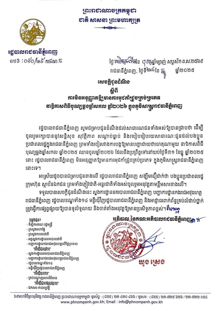 រាជធានីភ្នំពេញ, រដ្ឋបាលរាជធានីភ្នំពេញ សូមជម្រាបជូនដំណឹងដល់សាធារណជនទាំងអស់ឱ្យបានជ្រាបថា ដើម្បី ចូលរួមរក្សាបាននូវសន្តិសុខ សុវត្ថិភាព សណ្តាប់ធ្នាប់ និងរបៀបរៀបរយសាធារណៈជូនដល់បងប្អូន ប្រជាពលរដ្ឋក្នុងរាជធានីភ្នំពេញ ព្រមទាំងចៀសវាងការបង្កឱ្យមានបញ្ហាជាយថាហេតុណាមួយ នាឱកាសពិធី បុណ្យឆ្លងឆ្នាំសកល ឆ្នាំ២០២៥ ឈានចូលឆ្នាំ២០២៦ ដែលនឹងប្រព្រឹត្តទៅនៅយប់ថ្ងៃទី៣១ ខែធ្នូ ឆ្នាំ២០២៥ នោះ រដ្ឋបាលរាជធានីភ្នំពេញ មិនអនុញ្ញាតឱ្យមានការអុជកាំជ្រួចគ្រប់ប្រភេទ ក្នុងភូមិសាស្រ្តរាជធានីភ្នំពេញ នោះទេ។