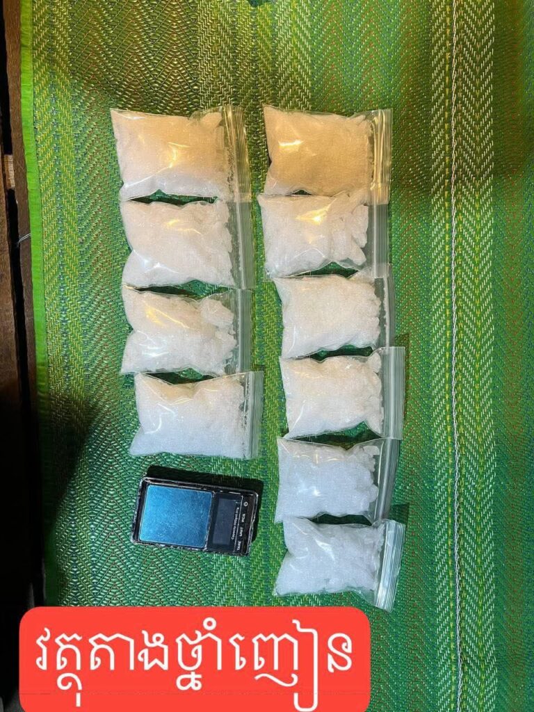 ត្រួតពិនិត្យឆែកឆេររកឃេីញ:- ម្សៅក្រាមពណ៌សសង្ស័យជាគ្រឿងញៀនចំនួន ១ កញ្ចប់ – ទូរស័ព្ទដៃចំនួន ២ គ្រឿង – ម៉ូតូ ០១ គ្រឿង- ឧបករណ៍កែច្នៃសម្រាប់ប្រើប្រាស់គ្រឿងញៀនមួយចំនួន ។