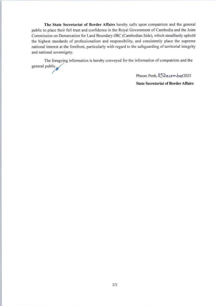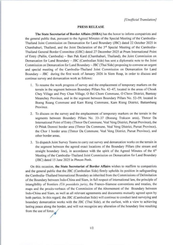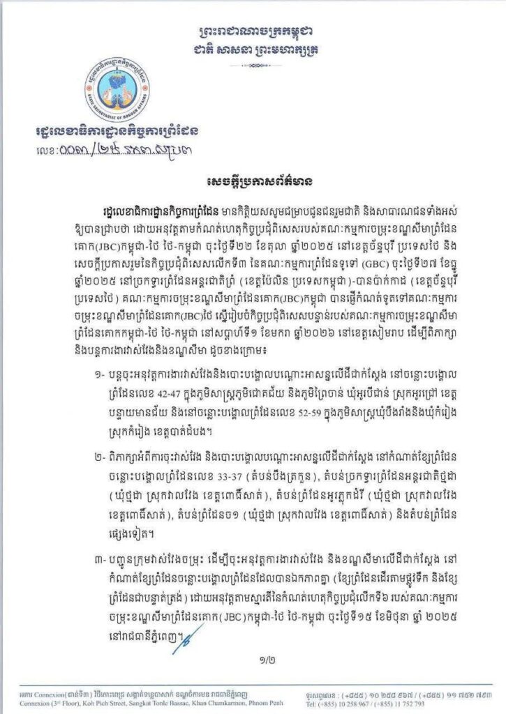 រដ្ឋលេខាធិការដ្ឋានកិច្ចការព្រំដែន សូមជម្រាបជូនជនរួមជាតិ និងសាធារណជនទាំងអស់ ឱ្យបានជ្រាបថា ដោយអនុវត្តតាមកំណត់ហេតុកិច្ចប្រជុំពិសេសរបស់គណៈកម្មការចម្រុះខណ្ឌសីមាព្រំដែន គោក(JBC)កម្ពុជា-ថៃ ថៃ-កម្ពុជា ចុះថ្ងៃទី២២ ខែតុលា ឆ្នាំ២០២៥ នៅខេត្តច័ន្ទបុរី ប្រទេសថៃ និង សេចក្ដីប្រកាសរួមនៃកិច្ចប្រជុំពិសេសលើកទី៣ នៃគណៈកម្មការព្រំដែនទូទៅ (GBC) ចុះថ្ងៃទី២៧ ខែធ្នូ ឆ្នាំ២០២៥ នៅច្រកទ្វារព្រំដែនអន្តរជាតិព្រំ (ខេត្តប៉ៃលិន ប្រទេសកម្ពុជា)-បានប៉ាក់កាដ (ខេត្តច័ន្ទបុរី ប្រទេសថៃ) គណៈកម្មការចម្រុះខណ្ឌសីមាព្រំដែនគោក(JBC)កម្ពុជា បានផ្ញើកំណត់ទូតទៅគណៈកម្មការ ចម្រុះខណ្ឌសីមាព្រំដែនគោក(JBC)ថៃ ស្នើរៀបចំកិច្ចប្រជុំពិសេសបន្ទាន់របស់គណៈកម្មការចម្រុះខណ្ឌសីមា ព្រំដែនគោកកម្ពុជា-ថៃ ថៃ-កម្ពុជា នៅសប្តាហ៍ទី១ ខែមករា ឆ្នាំ២០២៦ នៅខេត្តសៀមរាប ដើម្បីពិភាក្សា និងបន្តការងារវាស់វែងនិងខណ្ឌសីមា ដូចខាងក្រោម៖
