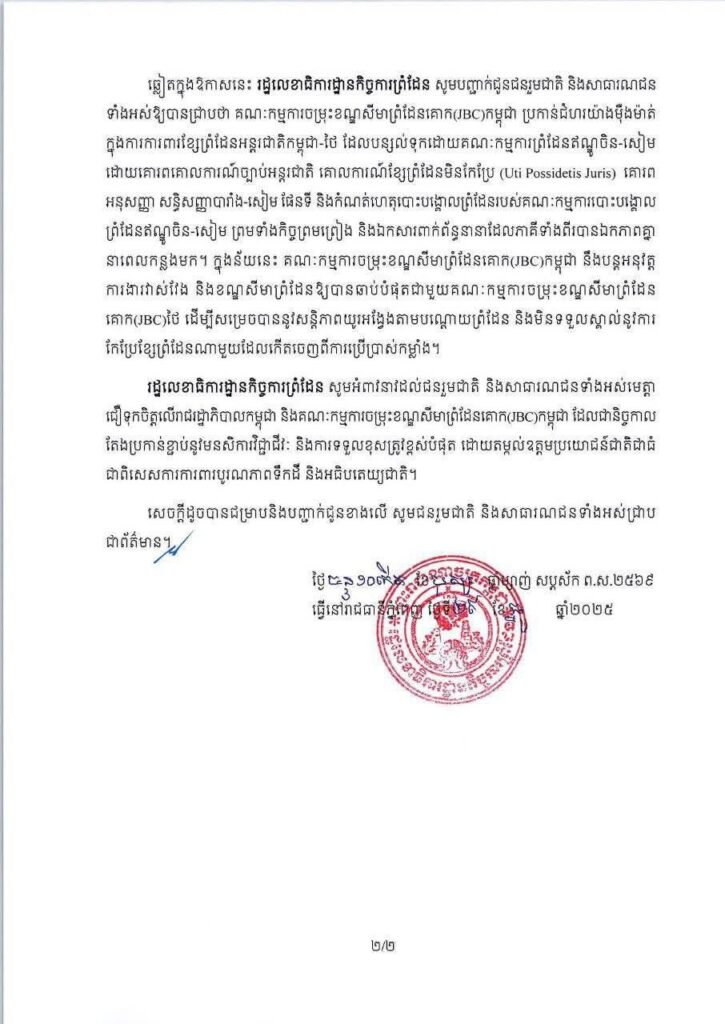 ទាំងអស់ឱ្យបានជ្រាបថា គណៈកម្មការចម្រុះខណ្ឌសីមាព្រំដែនគោក(JBC)កម្ពុជា ប្រកាន់ជំហរយ៉ាងម៉ឺងម៉ាត់ ក្នុងការការពារខ្សែព្រំដែនអន្តរជាតិកម្ពុជា-ថៃ ដែលបន្សល់ទុកដោយគណៈកម្មការព្រំដែនឥណ្ឌូចិន-សៀម ដោយគោរពគោលការណ៍ច្បាប់អន្តរជាតិ គោលការណ៍ខ្សែព្រំដែនមិនកែប្រែ (Uti Possidetis Juris) គោរព អនុសញ្ញា សន្ធិសញ្ញាបារាំង-សៀម ផែនទី និងកំណត់ហេតុបោះបង្គោលព្រំដែនរបស់គណៈកម្មការបោះបង្គោល ព្រំដែនឥណ្ឌូចិន-សៀម ព្រមទាំងកិច្ចព្រមព្រៀង និងឯកសារពាក់ព័ន្ធនានាដែលភាគីទាំងពីរបានឯកភាពគ្ន នាពេលកន្លងមក។ ក្នុងន័យនេះ គណៈកម្មការចម្រុះខណ្ឌសីមាព្រំដែនគោក(JBC)កម្ពុជា នឹងបន្តអនុវត្ត ការងារវាស់វែង និងខណ្ឌសីមាព្រំដែនឱ្យបានឆាប់បំផុតជាមួយគណៈកម្មការចម្រុះខណ្ឌសីមាព្រំដែន គោក(JBC)ថ ដើម្បីសម្រេចបាននូវសន្តិភាពយូរអង្វែងតាមបណ្ដោយព្រំដែន និងមិនទទួលស្គាល់នូវការ