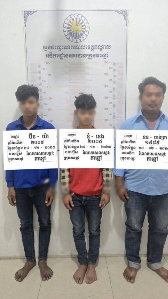 កណ្តាល÷ បុរសជាជនសង្ស័យចំនួន០៣នាក់ ក្នុងនោះម្នាក់ជាអ្នករត់ម៉ូតូកង់បី ឯជនសង្ស័យ០២នាក់ទៀតជាមេការផ្ទះសំណាក់ ករណីរំលោភសេពសន្ថវ:ទៅលើស្ត្រីរងគ្រោះជាភ្ញៀវ ជាថ្នូ.រនឹងការកាត់កង ព្រោះគ្មានប្រាក់បង់ថ្លៃឈ្នួលផ្ទះសំណាក់និងកង់បី។ ហេតុការណ៏នេះបានកើតឡើងកាលពីវេលាម៉ោង ២២និង៣០នាទី ថ្ងៃទី២៦ខែធ្នូឆ្នាំ២០២៥ នៅចំណុចក្នុងផ្ទះសំណាក់បន្ទប់លេខ B999 ស្ថិតក្នុងភូមិខ្ពបវែង សង្កាត់កំពង់សំណាញ់ ក្រុងតាខ្មៅ ខេត្តកណ្តាល។