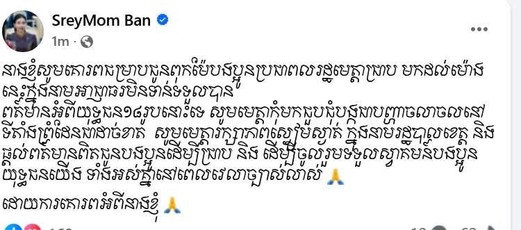 លោកជំទាវ បាន ស្រីមុំ បានថ្លែងបន្តទៀតថា នាងខ្ញុំសូមគោរពជម្រាបជូនពុកម៉ែបងប្អូនប្រជាពលរដ្ឋមេត្តាជ្រាប មកដល់ម៉ោងនេះ ក្នុងនាមអាជ្ញាធរមិនទាន់ទទួលបាន