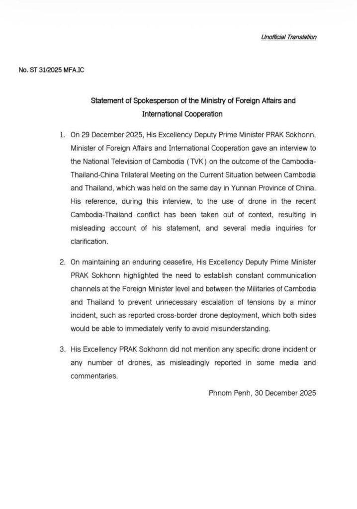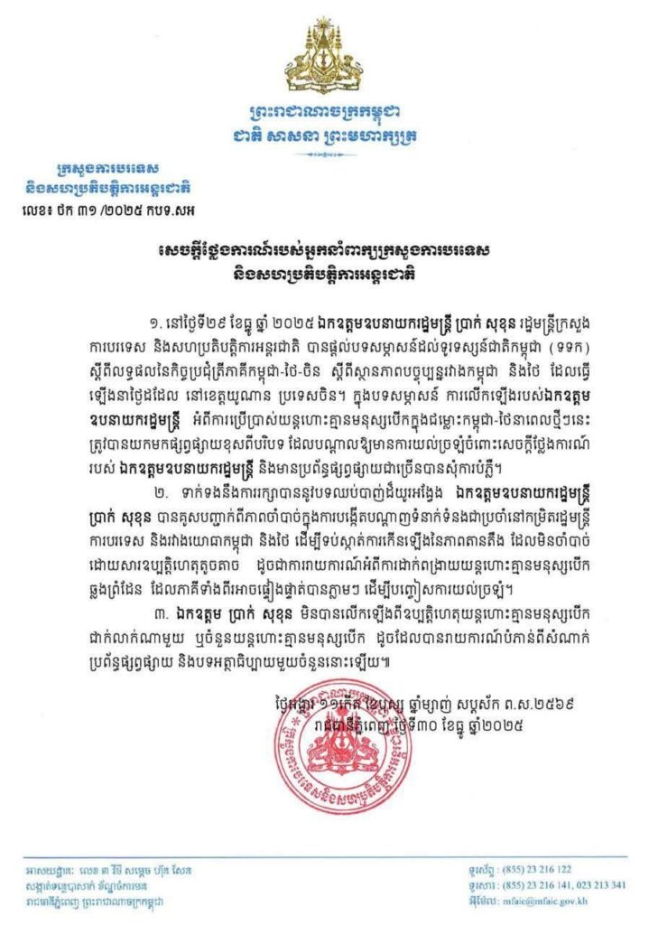 ១. នៅថ្ងៃទី២៩ ខែធ្នូ ឆ្នាំ ២០២៥ ឯកឧត្តមឧបនាយករដ្ឋមន្ត្រី ប្រាក់ សុខុន រដ្ឋមន្ត្រីក្រសួង ការបរទេស និងសហប្រតិបត្តិការអន្តរជាតិ បានផ្តល់បទសម្ភាសន៍ដល់ទូរទស្សន៍ជាតិកម្ពុជា (ទទក) ស្តីពីលទ្ធផលនៃកិច្ចប្រជុំត្រីភាគីកម្ពុជា-ថៃ-ចិន ស្តីពីស្ថានភាពបច្ចុប្បន្នរវាងកម្ពុជា និងថៃ ដែលធ្វើ ឡើងនាថ្ងៃដដែល នៅខេត្តយូណាន ប្រទេសចិន។ ក្នុងបទសម្ភាសន៍ ការលើកឡើងរបស់ឯកឧត្តម ឧបនាយករដ្ឋមន្ត្រី អំពីការប្រើប្រាស់យន្តហោះគ្មានមនុស្សបើកក្នុងជម្លោះកម្ពុជា-ថៃនាពេលថ្មីៗនេះ ត្រូវបានយកមកផ្សព្វផ្សាយខុសពីបរិបទ ដែលបណ្តាលឱ្យមានការយល់ច្រឡំចំពោះសេចក្តីថ្លែងក របស់ឯកឧត្តមឧបនាយករដ្ឋមន្ត្រី និងមានប្រព័ន្ធផ្សព្វផ្សាយជាច្រើនបានសុំការបំភ្លឺ។