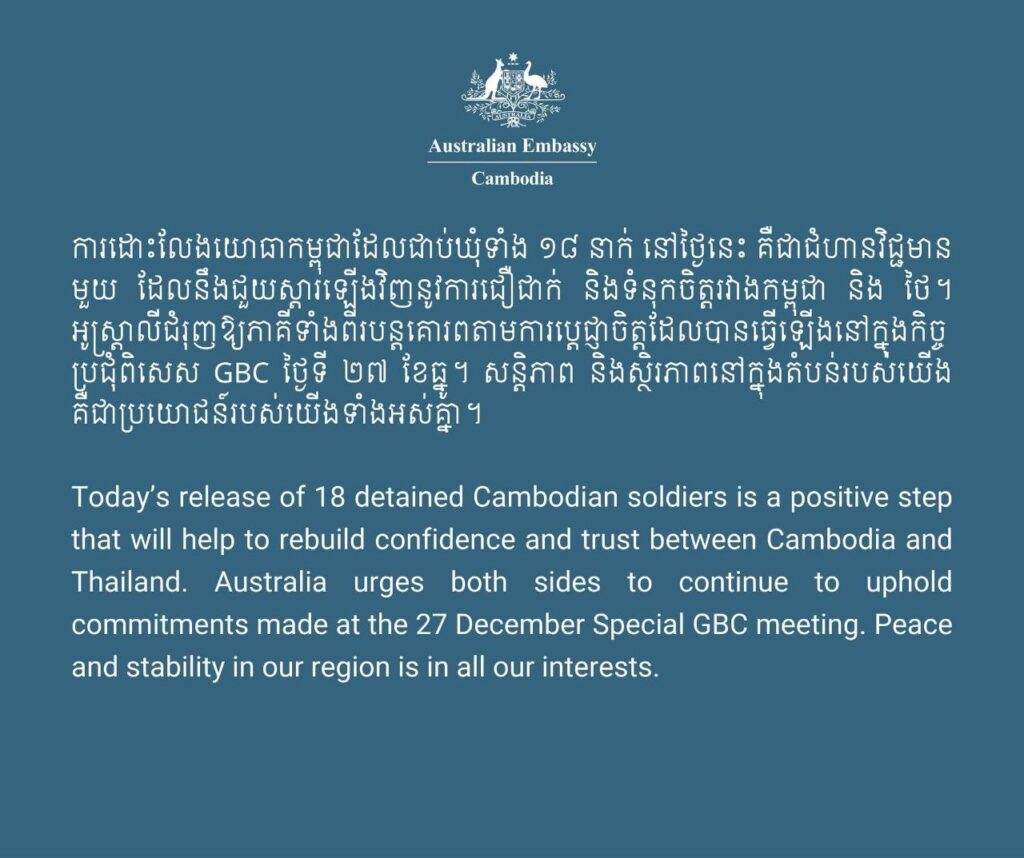 ភ្នំពេញ ៖ ស្ថានទូតអូស្រ្តាលីប្រចាំកម្ពុជា នៅថ្ងៃទី៣១ ខែធ្នូ ឆ្នាំ២០២៥ បានឲ្យថា ការដោះលែងយោធាកម្ពុជាដែលជាប់ឃុំទាំង ១៨ នាក់ នៅថ្ងៃនេះ គឺជាជំហានវិជ្ជមាន មួយ ដែលនឹងជួយស្ដារឡើងវិញនូវការជឿជាក់ និងទំនុកចិត្តរវាងកម្ពុជា និង ថៃ។