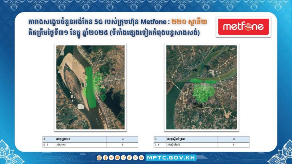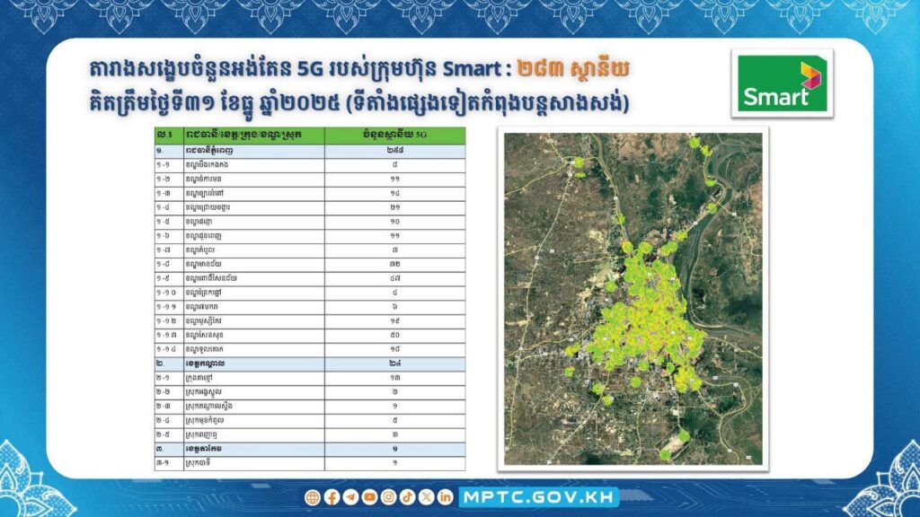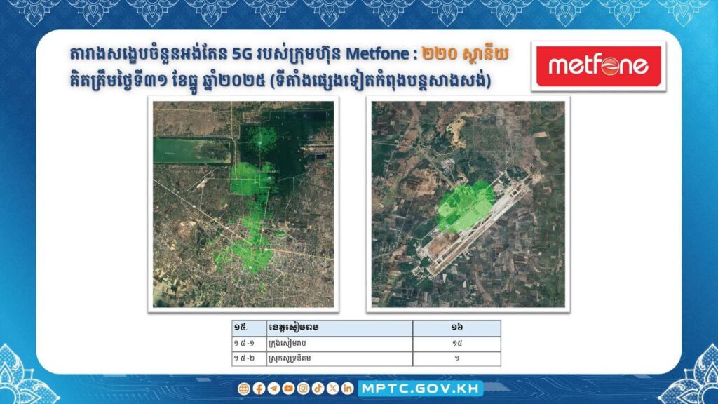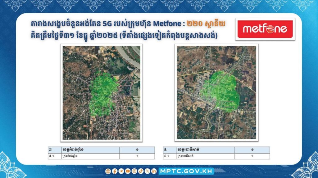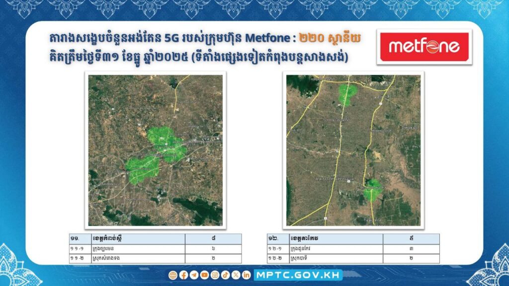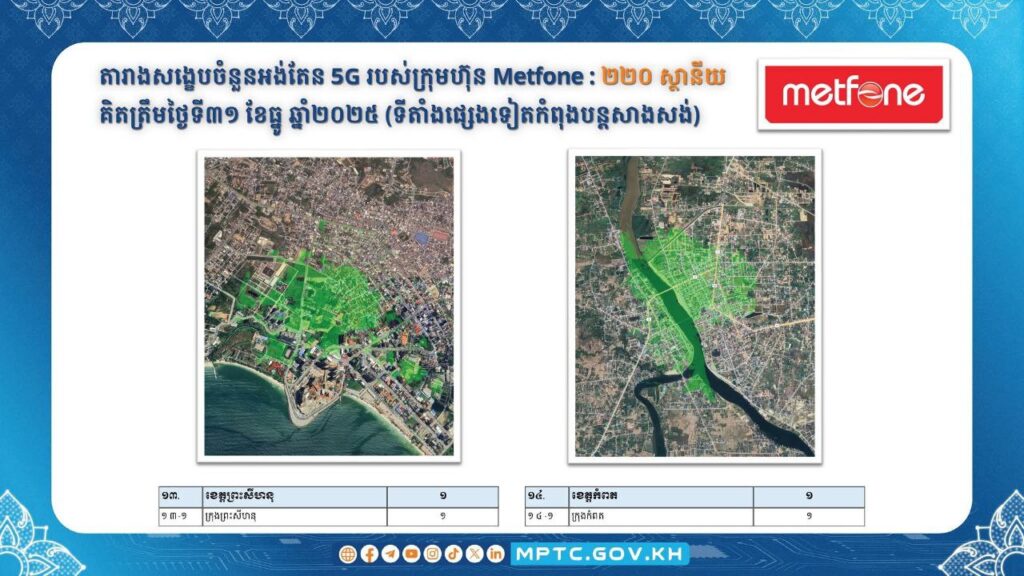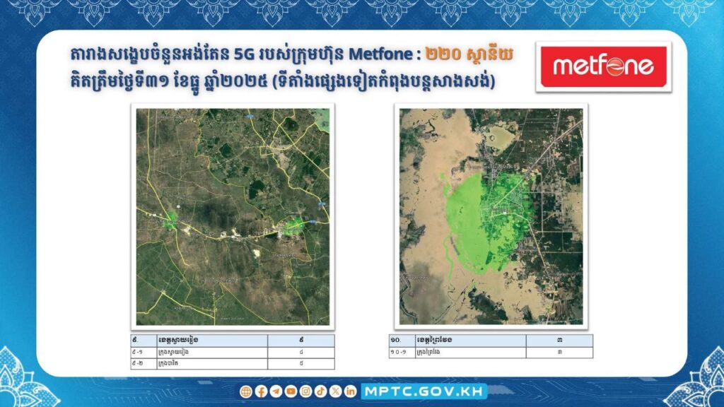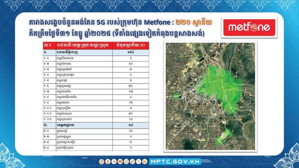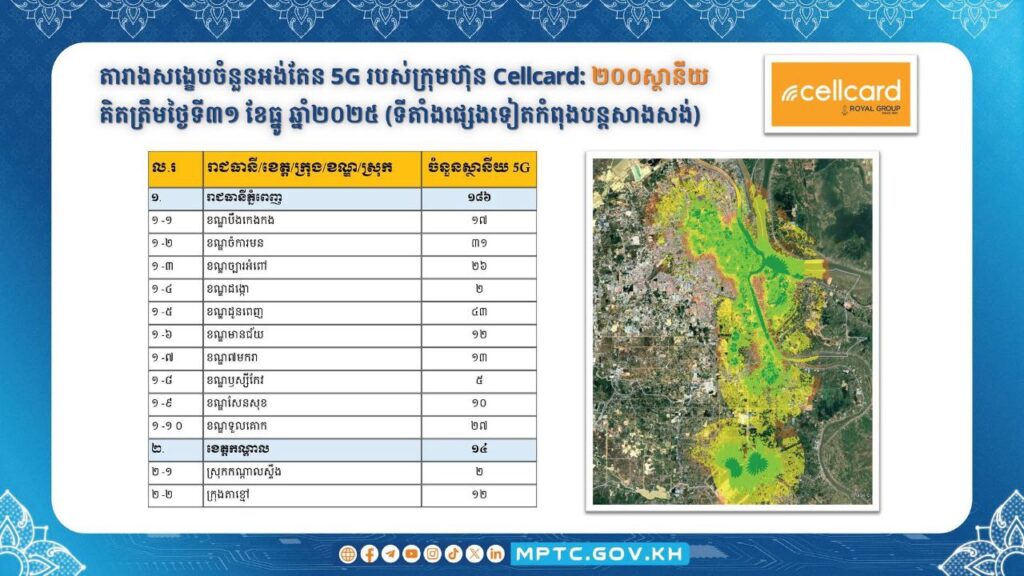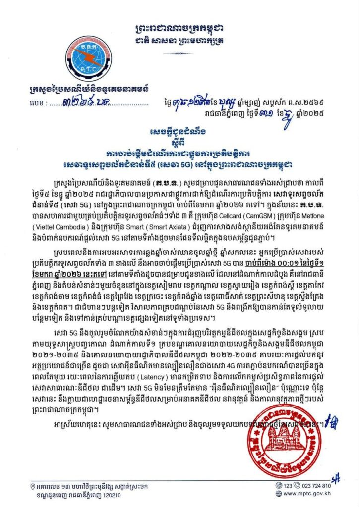 ក្រសួងប្រៃសណីយ៍និងទូរគមនាគមន៍ (ក.ប.ទ.) សូមជម្រាបជូនសាធារណជនទាំងអស់ជ្រាបថា កាលពីថ្ងៃទី៥ ខែធ្នូ ឆ្នាំ២០២៥ រាជរដ្ឋាភិបាលបានប្រកាសជាផ្លូវការដាក់ឱ្យដំណើរការប្រតិបត្តិការ សេវាទូរសព្ទចល័តជំនាន់ទី៥ ឬសេវា 5G នៅក្នុងព្រះរាជាណាចក្រកម្ពុជា ចាប់ពីខែមករា ឆ្នាំ២០២៦ តទៅ។ ក្នុងន័យនេះ ក.ប.ទ. បានសហការជាមួយគ្រប់ប្រតិបត្តិករទូរសព្ទចល័តធំៗទាំង ៣ គឺ ក្រុមហ៊ុន Cellcard (CamGSM) ក្រុមហ៊ុន Metfone (Viettel Cambodia) និងក្រុមហ៊ុន Smart (Smart Axiata) ជំរុញការសាងសង់ស្ថានីយអង់តែនទូរគមនាគមន៍និងបំពាក់ឧបករណ៍ផ្តល់សេវា 5G នៅតាមទីតាំងដូចមានផែនទីលម្អិតក្នុងឧបសម្ព័ន្ធជូនភ្ជាប់។