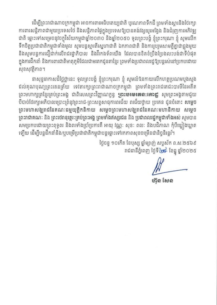សម្តេចតេជោ បានថ្លែងថា ដើម្បីព្រះរាជាណាចក្រកម្ពុជា អាចការពារអធិបតេយ្យជាតិ បូរណភាពទឹកដី ព្រមទាំងស្តារនិងថែរក្សា ការពារសន្តិភាពជាមួយប្រទេសថៃ និងសន្តិភាពផ្ទៃក្នុងប្រទេសឱ្យបានគង់វង្សយូរអង្វែង និងជំរុញការអភិវឌ្ឍ ជាតិ ឆ្ពោះទៅសម្រេចនូវចក្ខុវិស័យកម្ពុជាឆ្នាំ២០៣០ និងឆ្នាំ២០៥០ ទូលព្រះបង្គំ ខ្ញុំព្រះករុណា ខ្ញុំ សូមលើក ទឹកចិត្តប្រជាជាតិកម្ពុជាទាំងមូល សូមបន្តស្មារតីស្នេហាជាតិ ឯកភាពជាតិ និងការរួបរួមសាមគ្គីគ្នាជាធ្លុងមួយ និងសូមបន្តការជឿជាក់លើរាជរដ្ឋាភិបាល និងវីរកងទ័ពយើង ដែលបានខិតខំប្រឹងប្រែងលះបង់ជាទីបំផុត ក្នុងការដឹកនាំ និងការពារជាតិមាតុភូមិដែលជាមរតកដូនតាខ្មែរ ព្រមទាំងប្រជាពលរដ្ឋឱ្យបន្តរស់នៅប្រកបដោយ សុខសុវត្ថិភាព៕ រក្សាសិទ្ធដោយ៖សុទ្ធលី