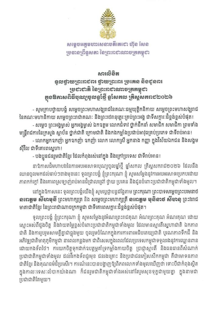រាជធានីភ្នំពេញ ៖ សារលិខិតជូនពរ សម្តេចអគ្គមហាសេនាបតីតេជោ ហ៊ុន សែន ប្រធានព្រឹទ្ធសភានៃព្រះរាជាណាចក្រកម្ពុជា និងជាប្រធានក្រុមឧត្តមប្រឹក្សាផ្ទាល់ព្រះមហាក្សត្រ នៃព្រះរាជាណាចក្រកម្ពុជា សូមទូលថ្វាយព្រះរាជពរ សម្តេចព្រះមហាសង្ឃរាជទាំងពីរគណៈ ថ្វាយសម្តេចព្រះរាជាគណៈ ថ្វាយព្រះពរសម្តេច ព្រះអង្គម្ចាស់ អ្នកអង្គម្ចាស់ ប្រគេនពរព្រះថេរានុត្ថេរៈគ្រប់ព្រះអង្គ និងជូនពរឯកឧត្តម លោកជំទាវ ថ្នាក់ដឹកនាំ មន្ត្រីរាជការ កងកម្លាំងប្រដាប់អាវុធគ្រប់ប្រភេទ លោកអ្នកឧកញ៉ា អ្នកឧកញ៉ា ឧកញ៉ា បងបងប្អូនជនរួមជាតិ នៃព្រះរាជាណាចក្រកម្ពុជា ក្នុងឱកាសពិធីបុណ្យចូលឆ្នាំថ្មី ឆ្នាំសាកល គ្រិស្តសករាជ២០២៦។