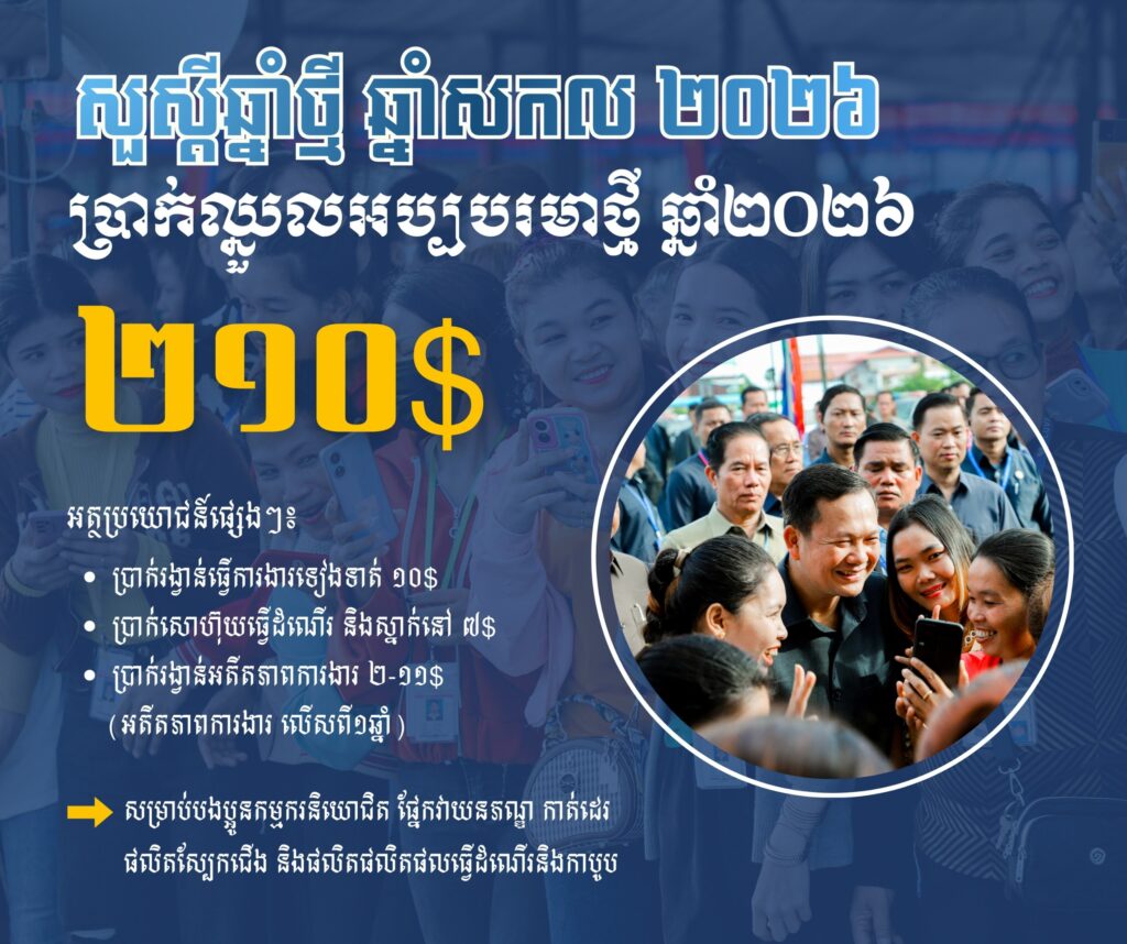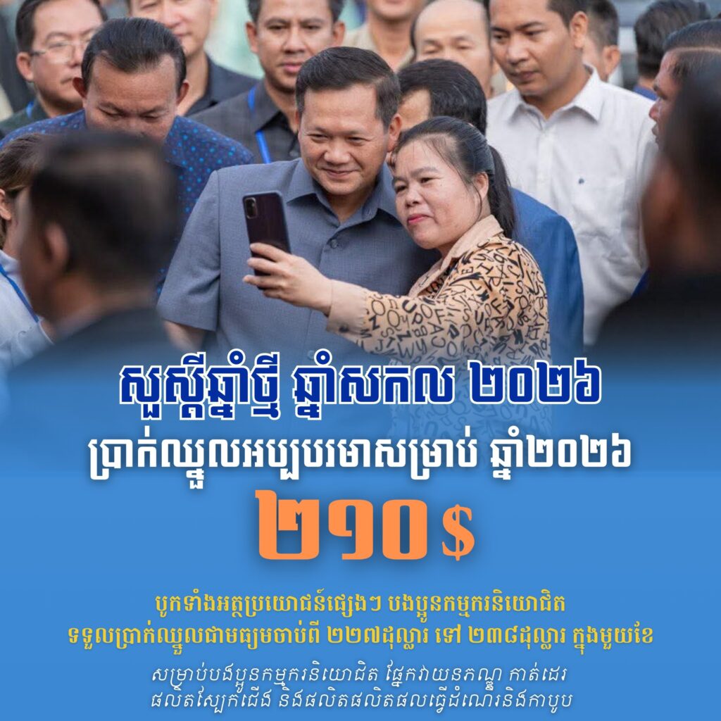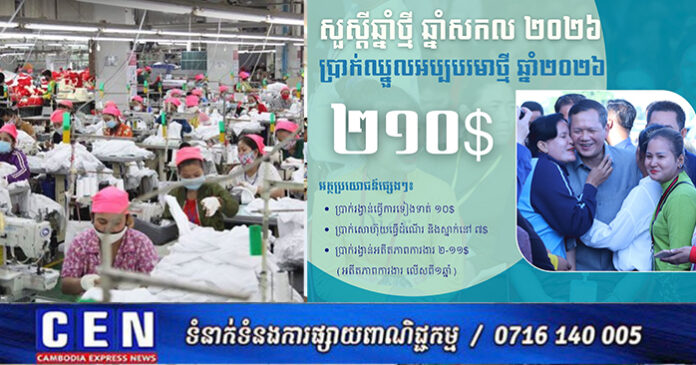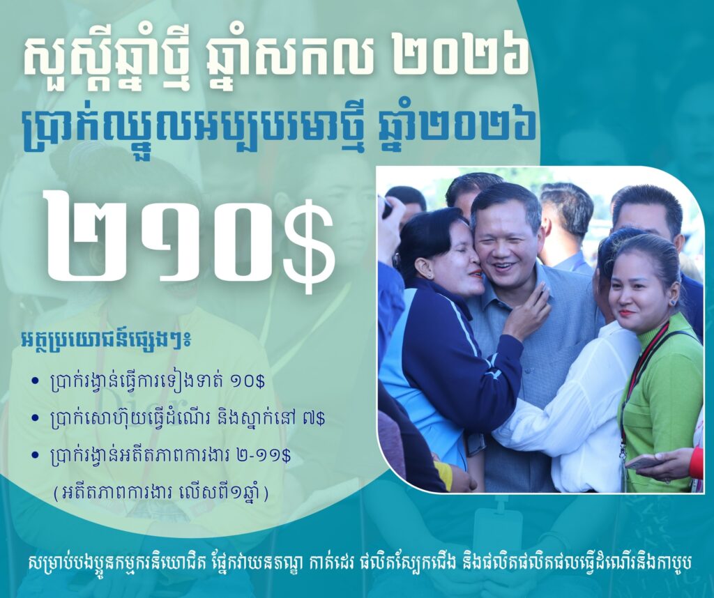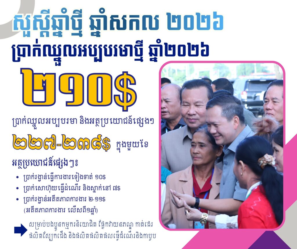 ក្នុងស្មារតីនេះ ក្រុមប្រឹក្សាជាតិប្រាក់ឈ្នួលអប្បបរមាបានស្នើតួលេខចំនួន ២០៨ (ពីររយប្រាំបី) ដុល្លារអាម៉េរិក ជូន សម្ដេចមហាបវរធិបតី ហ៊ុន ម៉ាណែត នាយករដ្ឋមន្ត្រីនៃព្រះរាជាណាចក្រកម្ពុជា ពិនិត្យនិងសម្រេច។ យោងលើរបាយការណ៍ និងការពិភាក្សាបន្ថែមជាមួយភាគីពាក់ព័ន្ធ សម្តេចធិបតីនាយករដ្ឋមន្ត្រី បានសម្រេចបន្ថែម ២ដុល្លារអាម៉េរិក លើតួលេខ ២០៨ ដុល្លារអាម៉េរិក របស់ក្រុមប្រឹក្សាជាតិប្រាក់ឈ្នួលអប្បបរមា ដែលធ្វើឱ្យប្រាក់ឈ្នួលអប្បបរមារបស់កម្មករនិយោជិតផ្នែក វាយនភណ្ឌ កាត់ដេរ ផលិតស្បែកជើង និងផលិតផលិតផលធ្វើដំណើរនិងកាបូប សម្រាប់ឆ្នាំ២០២៦ មានចំនួន ២១០ (ពីររយដប់) ដុល្លារអាម៉េរិក ក្នុងមួយខែ ហើយនឹងត្រូវអនុវត្តចាប់ពីថ្ងៃទី១ ខែមករា ឆ្នាំ២០២៦ តទៅ។ បើបូកទាំងអត្ថប្រយោជន៍ផ្សេងទៀត បងប្អូនកម្មករនិយោជិតនឹងទទួលបានប្រាក់ឈ្នួលយ៉ាងតិចចន្លោះពី ២២៧ ដុល្លារអាម៉េរិក ដល់ ២៣៨ដុល្លារអាម៉េរិក ក្នុងមួយខែ។