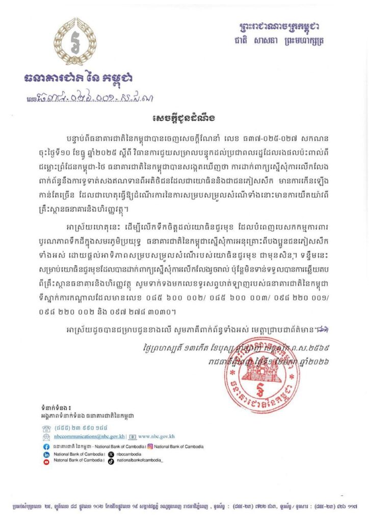 រាជធានីភ្នំពេញ ៖នៅថ្ងៃទី១ ខែមករា ឆ្នាំ២០២៦នេះ បន្ទាប់ពីធនាគារជាតិនៃកម្ពុជាបានចេញសេចក្តីណែនាំ លេខ ធ៣៧-០២៥-០២៧ សកណន ចុះថ្ងៃទី១០ ខែធ្នូ ឆ្នាំ២០២៥ ស្តីពី វិធានការជួយសម្រាលបន្ទុកដល់ប្រជាពលរដ្ឋដែលរងផលប៉ះពាល់ពី ជម្លោះព្រំដែនកម្ពុជា-ថៃ ធនាគារជាតិនៃកម្ពុជាបានសង្កេតឃើញថា ការដាក់ពាក្យស្នើសុំការលើកលែង ពាក់ព័ន្ធនឹងការទូទាត់សងឥណទានពីអតិថិជនដែលជាយោធិននិងជាជនភៀសសឹក មានការកើនឡើង កាន់តែច្រើន ដែលជាហេតុធ្វើឱ្យដំណើរការនៃការសម្របសម្រួលសំណើទាំងនោះមានការយឺតយ៉ាវពី គ្រឹះស្ថានធនាគារនិងហិរញ្ញវត្ថុ។