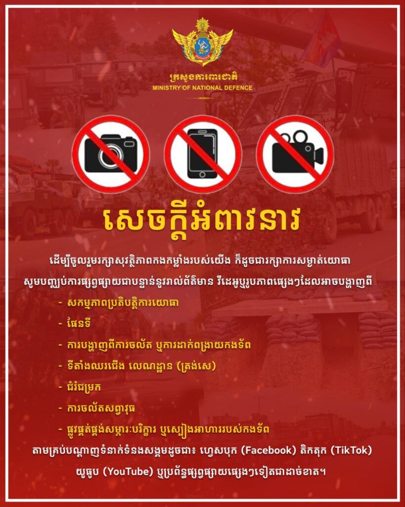 ភ្នំពេញ ៖ ក្រសួងការពារជាតិបានចេញសេចក្តីអំពាវនាវថា ដើម្បីចូលរួមរក្សាសុវត្ថិភាពកងកម្លាំងរបស់យើង ក៏ដូចជារក្សាការសម្ងាត់យោធា សូមបញ្ឈប់ការផ្សព្វផ្សាយជាបន្ទាន់នូវរាល់ ព័ត៌មាន, វីដេអូ ឬរូបភាពដែលអាចបង្ហាញពីសកម្មភាពប្រតិបត្តិការយោធា, ផែនទី, ការបង្ហាញពីការចល័ត ឬការដាក់ពង្រាយកងទ័ព, ទីតាំងឈរជើង, លេណដ្ឋាន (ត្រង់សេ), ជំរុំជម្រក, ការចល័តសព្វាវុធ, ផ្លូវផ្គត់ផ្គង់សម្ភារបរិក្ខារ ឬស្បៀងអាហារ របស់កងទ័ព តាមគ្រប់បណ្តាញទំនាក់ទំនងសង្គម ដូចជា Facebook, TikToK, Youtube ឬប្រព័ន្ធផ្សព្វផ្សាយផ្សេងៗទៀតជាដាច់ខាត៕ រក្សាសិទ្ធដោយ៖សុទ្ធលី