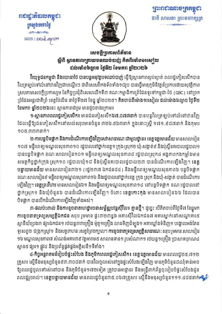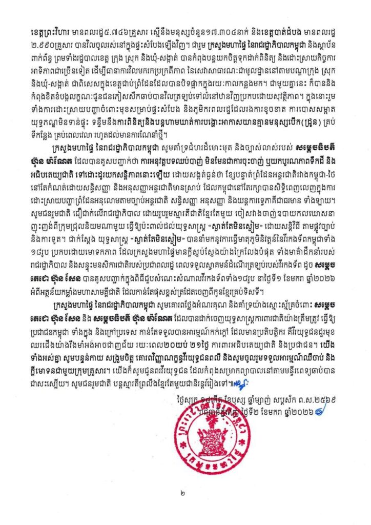 បានចេញសេចក្តីប្រកាសព័ត៍មានស្ដីពី ស្ថានភាពក្រោយបទឈប់បាញ់ គិតពីម៉ោង១រសៀល ដល់ម៉ោង៦ល្ងាច ថ្ងៃទី២ ខែមករា ឆ្នាំ២០២៦។