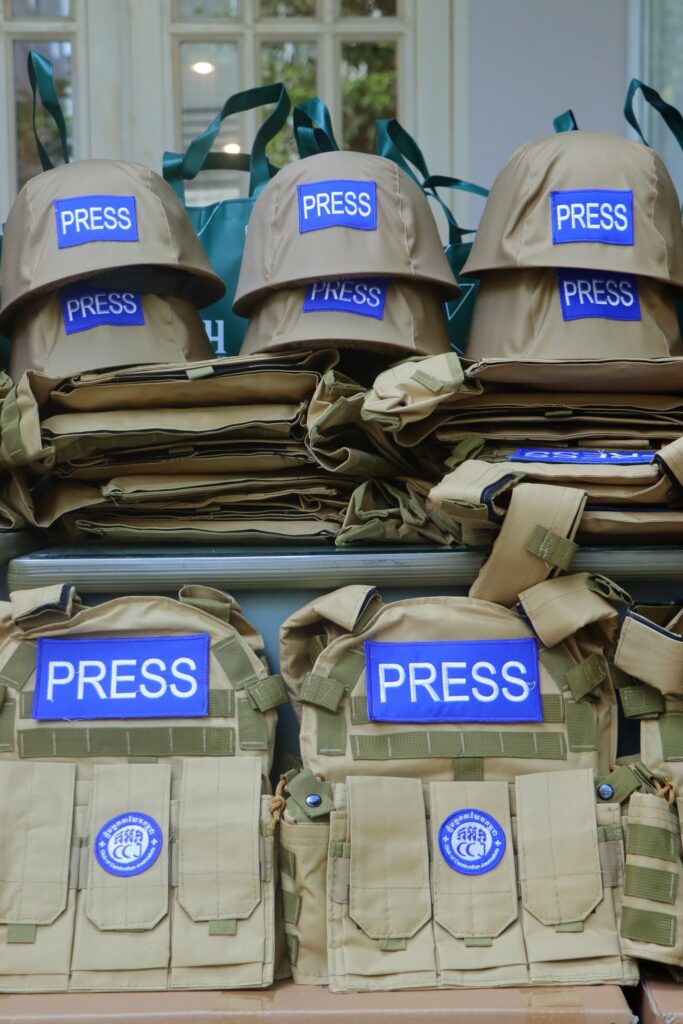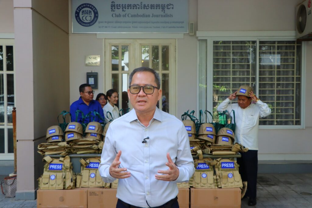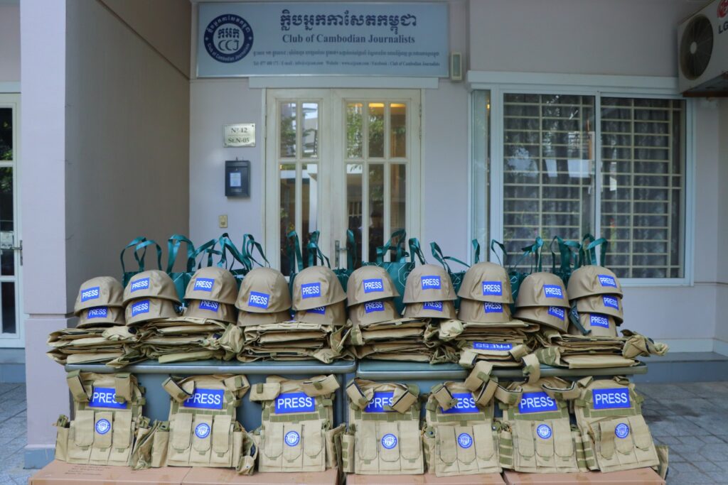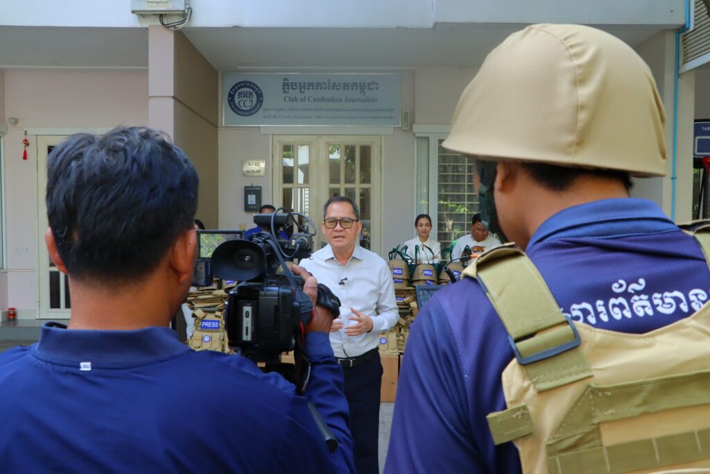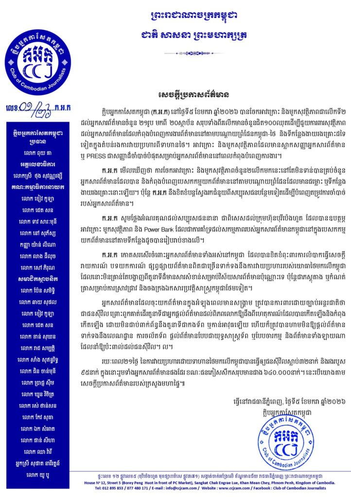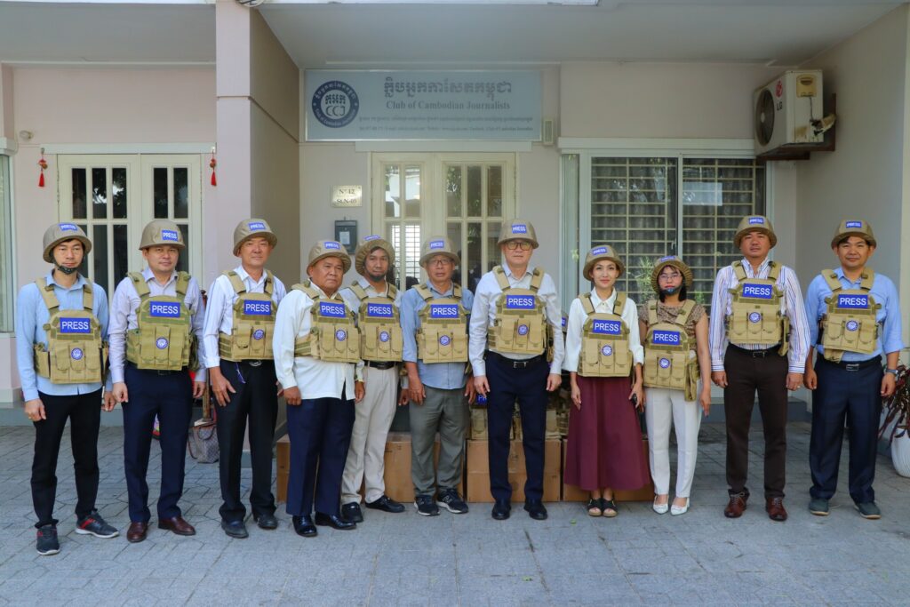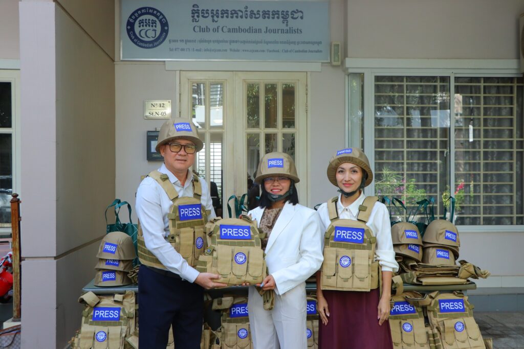 ភ្នំពេញ ៖ ក្លិបអ្នកកាសែតកម្ពុជា (ក.អ.ក) នៅថ្ងៃទី៥ ខែមករា ឆ្នាំ២០២៦ បានចែកអាវក្រោះ និងមួកសុវត្ថិភាពជាលើកទី២ ដល់អ្នកសារព័ត៌មានចំនួន ២១រូប មកពី ២០ស្ថាប័ន សរុបទាំងពីរលើកមានចំនួនជិត១០០ឈុតដើម្បីជួយការពារសុវត្ថិភាព ដល់អ្នកសារព័ត៌មានដែលកំពុងបំពេញការងារព័ត៌មាននៅតាមបណ្ដោយព្រំដែនកម្ពុជា-ថៃ និងទីកន្លែងងាយរងគ្រោះដទ ទៀតក្នុងតំបន់រងការវាយប្រហារពីទាហានថៃ។ អាវក្រោះ និងមួកសុវត្ថិភាពដែលមានស្លាកសញ្ញាអ្នកសារព័ត៌មាន ឬ PRESS ជាសញ្ញាដ៏ចាំបាច់បំផុតសម្រាប់អ្នកសារព័ត៌មាននៅពេលកំពុងបំពេញការងារ។