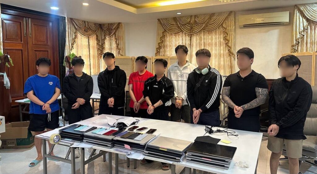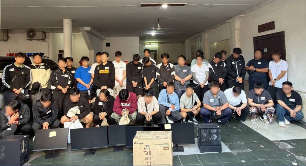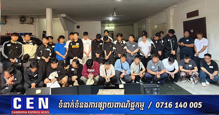 ភ្នំពេញ ៖ កម្លាំងសមត្ថកិច្ចនៃអគ្គស្នងការដ្ឋាននគរបាលជាតិ បានឃាត់ខ្លួនជនជាតិកូរ៉េខាងត្បូងចំនួន ៣២នាក់ ដែលបានប្រព្រឹត្តបទល្មើសឆបោកអនឡាញ ក្នុងទីតាំង ៤ផ្សេងគ្នា ស្ថិតនៅភូមិសាស្រ្តបុរីប៉េងហួតបឹងស្នោរ ខណ្ឌច្បារអំពៅ រាជធានីភ្នំពេញ ។