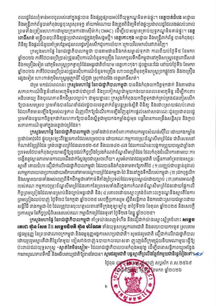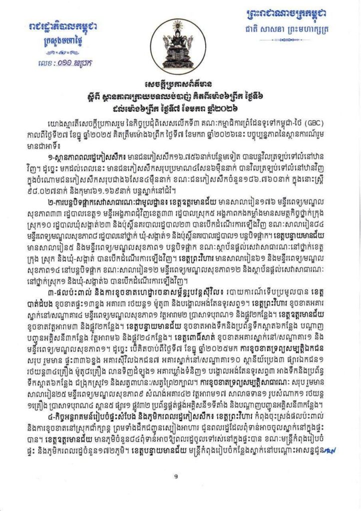 ភ្នំពេញ៖ មានជនភៀសសឹក ១៦ ៧៥៦នាក់ បន្ថែមទៀត បានបន្តវិលត្រឡប់ទៅលំនៅឋានវិញ។ ដូច្នេះ មកដល់ពេលនេះ មានជនភៀសសឹកសរុបប្រមាណ៤សែន៦ម៉ឺននាក់ បានវិលត្រឡប់ទៅលំនៅឋានវិញ ក្នុងចំណោមជនភៀសសឹកសរុបជាង៦សែន៤ម៉ឺននាក់។ មានជនភៀសសឹកចំនួន ១៨៦ ៧៦០នាក់ បន្តស្នាក់នៅជំរំ។នេះបើតាមសេចក្តីប្រកាសព័ត៌មានរបស់ក្រសួងមហាផ្ទៃនាថ្ងៃទី៧ខែមករាឆ្នាំ២០២៦នេះ៕ រក្សាសិទ្ធដោយ៖សុទ្ធលី