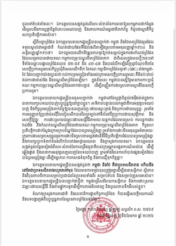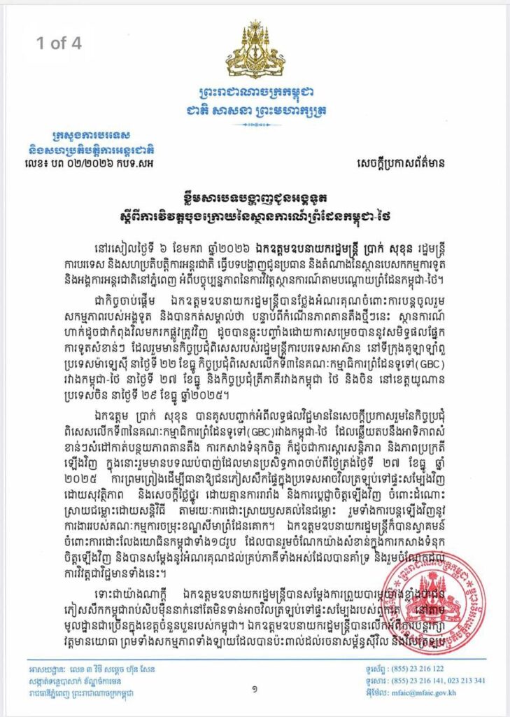 ភ្នំពេញ៖ ឯកឧត្តមឧបនាយករដ្ឋមន្ត្រី ប្រាក់ សុខុន រដ្ឋមន្ត្រីក្រសួងការបរទេស និងសហប្រតិបត្តិការអន្តរជាតិ ធ្វើបទបង្ហាញជូនប្រធាន និងតំណាងនៃស្ថានបេសកកម្មការទូត និងអង្គការអន្តរជាតិនៅភ្នំពេញ អំពីបច្ចុប្បន្នភាពនៃការវិវត្តស្ថានការណ៍តាមបណ្ដោយព្រំដែនកម្ពុជា-ថៃ។នេះបើតាមសេចក្តីប្រកាសព័ត៌មានរបស់ក្រសួងការបរទេស និងសហប្រតិបត្តិការអន្តរជាតិនាថ្ងៃទី៧ខែមករាឆ្នាំ២០២៦នេះ៕ រក្សាសិទ្ធដោយ៖សុទ្ធលី