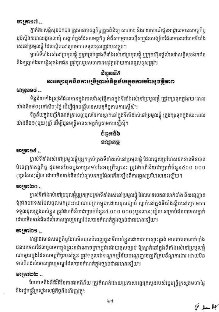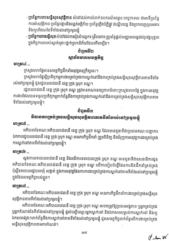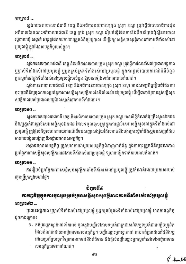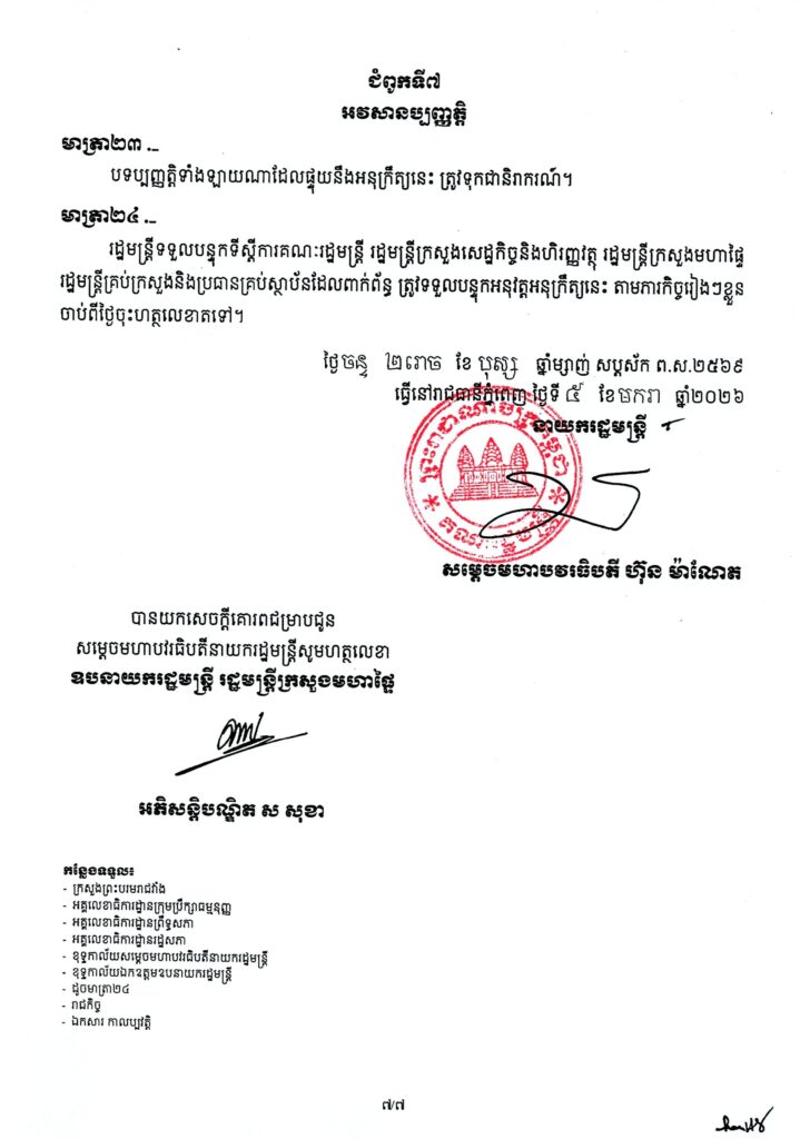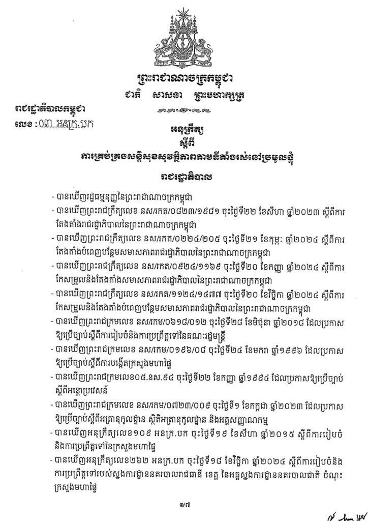 ភ្នំពេញ៖ សម្ដេចមហាបវរធិបតី ហ៊ុន ម៉ាណែត នាយករដ្ឋមន្ដ្រីនៃកម្ពុជា បានចេញអនុក្រឹត្យស្ដីពីការគ្រប់គ្រងសន្ដិសុខសុវត្ថិភាព តាមទីតាំងរស់នៅប្រមូលផ្ដុំ ដើម្បីធានាសន្ដិសុខ សុវត្ថិភាពសង្គម និងសណ្ដាប់ធ្នាប់សាធារណៈ។ នេះបើតាមអនុក្រឹត្យដែលបណ្ដាញព័ត៌មានទទួលបាននៅព្រឹកថ្ងៃទី៧ ខែមករា ឆ្នាំ២០២៥៕រក្សាសិទ្ធដោយ៖សុទ្ធលី