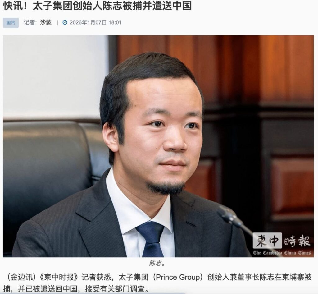 បើយោងតាមសារព័ត៌មាន CC Times ផ្សាយជាភាសាចិននៅល្ងាចថ្ងៃទី៧ ខែមករា ឆ្នាំ២០២៦ បានបញ្ជាក់ថា ករណីលាងលុយឆ្លងដែនរបស់ក្រុមហ៊ុន Prince Group បានទាក់ទាញការចាប់អារម្មណ៍យ៉ាងខ្លាំងជុំវិញពិភពលោក។ យោងតាមព័ត៌មានចុងក្រោយ លោក Chen Zhi ដែលជាស្ថាបនិក និងជាប្រធានក្រុមហ៊ុននេះ ត្រូវបានចាប់ខ្លួននៅក្នុងប្រទេសកម្ពុជា ហើយត្រូវបានបញ្ជូនទៅកាន់ដីគោក ដើម្បីធ្វើការស៊ើបអង្កេតបន្តដោយនាយកដ្ឋានពាក់ព័ន្ធ។