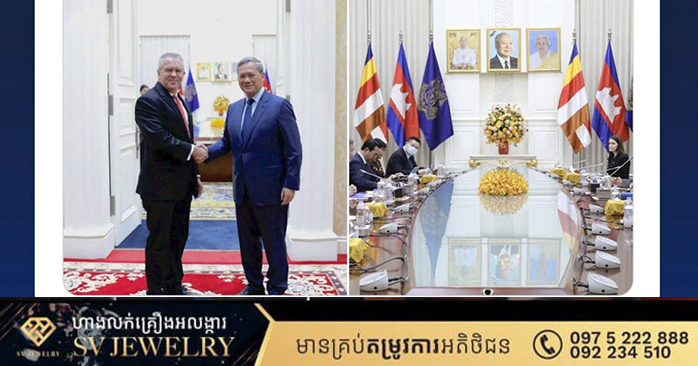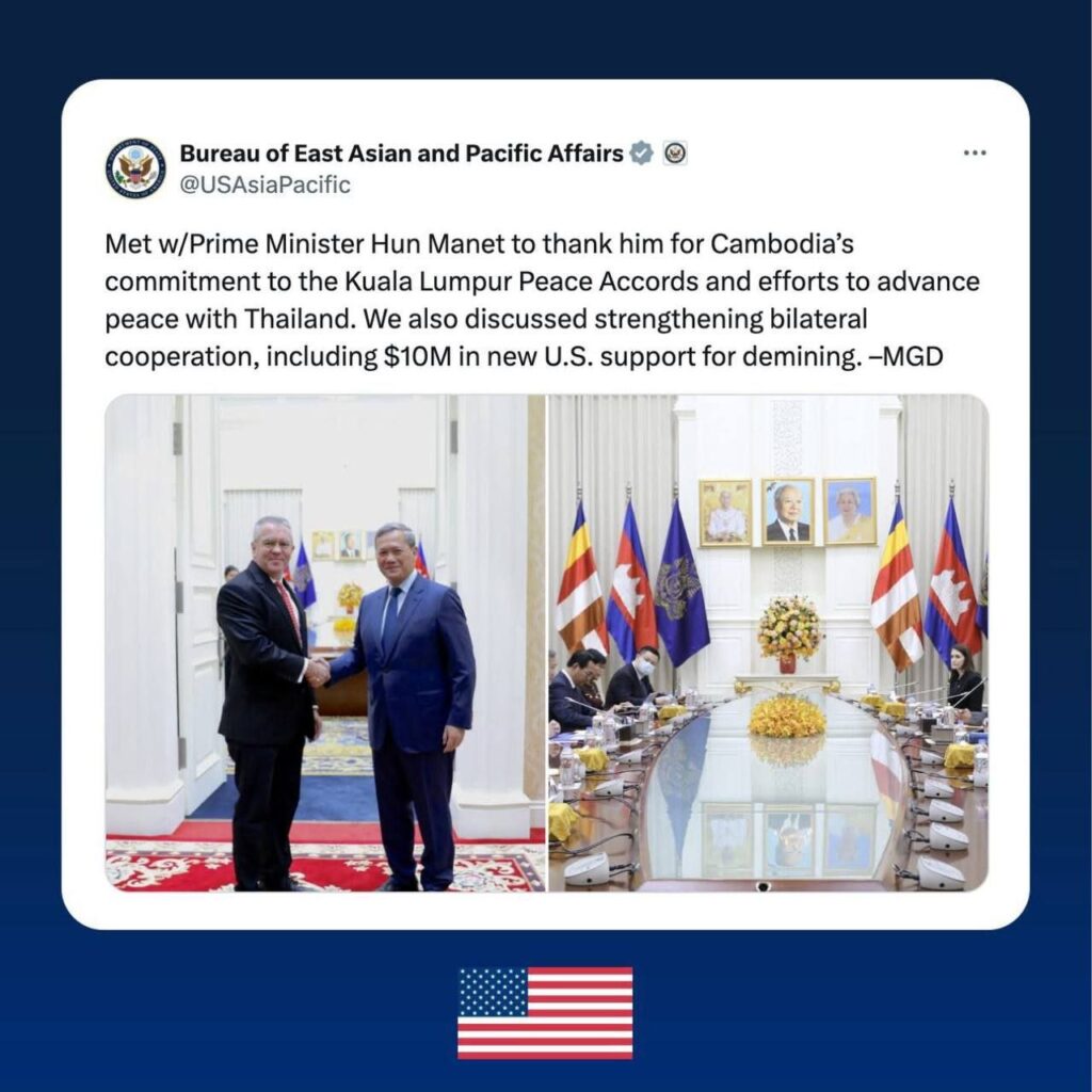 ភ្នំពេញ ៖ យោងតាមការបង្ហោះផ្សាយនៅក្នុងបណ្តាញសង្គមរបស់ស្ថានទូតសហរដ្ឋអាមេរិកប្រចាំព្រះរាជាណាចក្រកម្ពុជា នៅព្រឹកថ្ងៃទី១១ ខែមករា ឆ្នាំ២០២៦ បានឱ្យដឹងថា លោក Michael G. DeSombre ឧបការីរដ្ឋមន្ត្រីការបរទេសសហរដ្ឋអាមេរិក បានជួបជាមួយសម្តេចនាយករដ្ឋមន្រ្តី ហ៊ុន ម៉ាណែត ដើម្បីថ្លែងអំណរគុណចំពោះការប្តេជ្ញាចិត្តរបស់កម្ពុជាលើកិច្ចព្រមព្រៀងសន្តិភាពទីក្រុងគូឡាឡាំពួ និងកិច្ចខិតខំប្រឹងប្រែងក្នុងការជំរុញសន្តិភាពជាមួយប្រទេសថៃ។