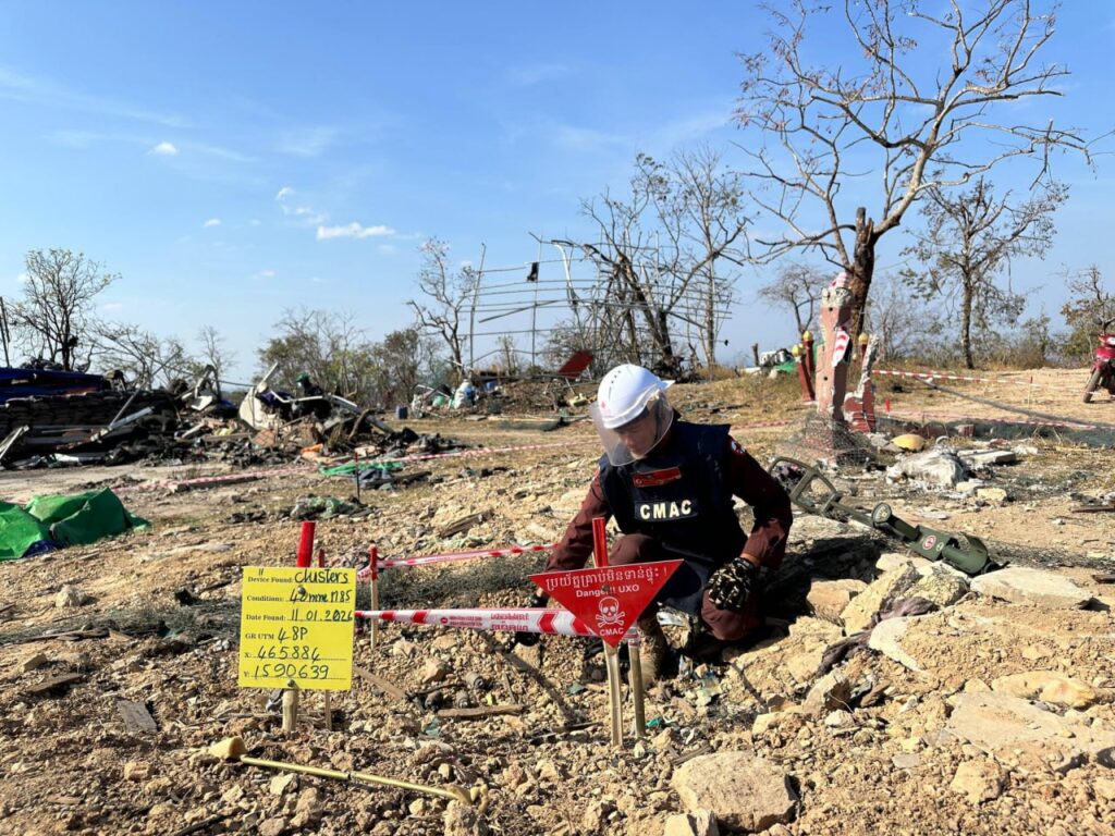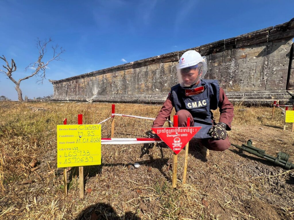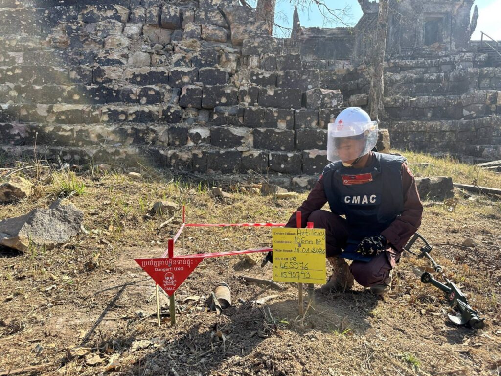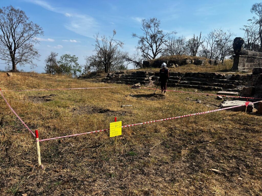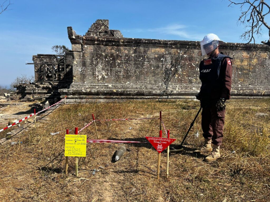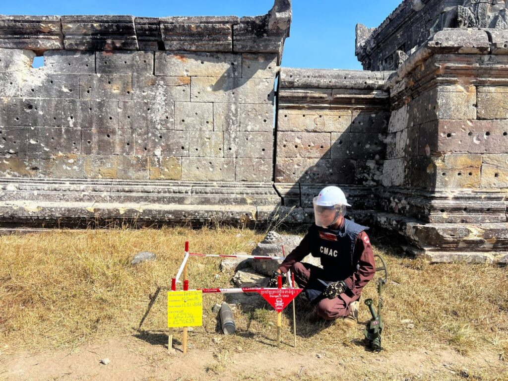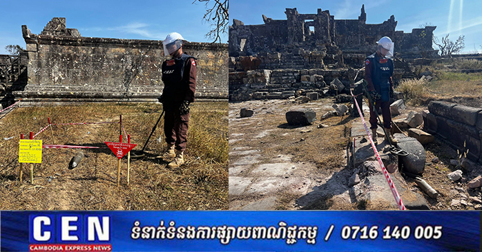 ព្រះវិហារ ៖ ឯកឧត្តម ហេង រតនា អគ្គនាយក មជ្ឈមណ្ឌលសកម្មភាពកំចាត់មីនកម្ពុជា ហៅកាត់ថាស៊ីម៉ាក់ (CMAC) បានបង្ហាញរូបភាពក្រុមការងារកំពុងបោសសំអាតកាកសំណល់អាវុធយុទ្ធភណ្ឌមិនទាន់ផ្ទុះនៅប្រាសាទព្រះវិហារ។