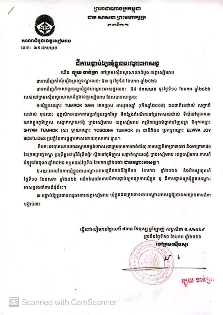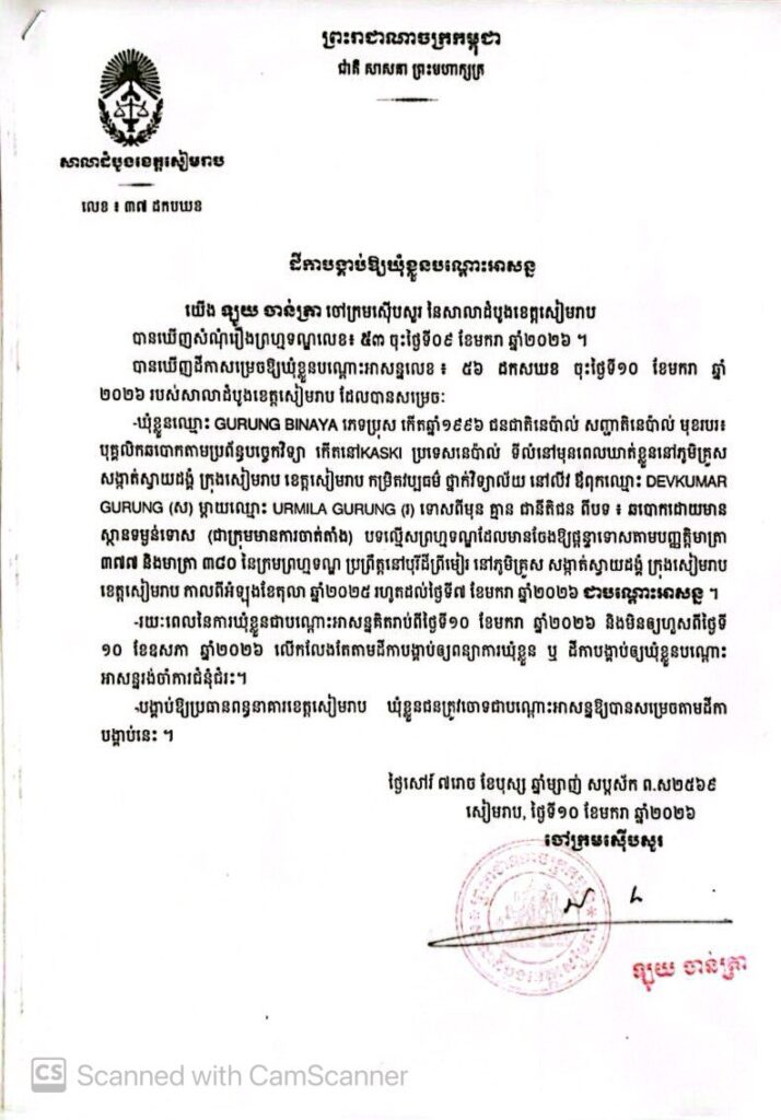 សៀមរាប៖ តុលាការខេត្តសៀមរាបសម្រេចឃុំខ្លួនបណ្តោះអាសន្នជនជាតិនេប៉ាល់ចំនួន ៣នាក់ដើម្បីអនុវត្តនីតិវិធីច្បាប់ពាក់ព័ន្ធនឹងការឆបោកតាមប្រព័ន្ធបច្ចេកវិទ្យា។