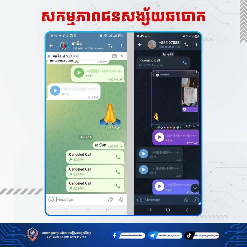 ភ្នំពេញ ៖ យោងតាមបញ្ជាដឹកនាំរបស់ ឯកឧត្ដម នាយឧត្ដមសេនីយ៍ ស ថេត អគ្គស្នងការនគរបាលជាតិ និងតាមការចង្អុលណែនាំពី ឯកឧត្ដម ឧត្ដមសេនីយ៍ឯក អគ្គស្នងការរងនគរបាលជាតិ កាលពីថ្ងៃទី៩ ខែមករា ឆ្នាំ២០២៦ នាយកដ្ឋានប្រឆាំងបទល្មើសបច្ចេកវិទ្យា បានបើកការស្រាវជ្រាវ និងបង្រ្កាបលើករណីករណី ជនអនាមិកបន្លំលួចគ្រប់គ្រង និងប្រើប្រាស់ គណនីបណ្ដាញសង្គម តេឡេក្រាម បោកបញ្ឆោតជនរងគ្រោះ ក្រោមរូបភាពបន្លំជាអ្នករកស៊ីជាមួយគ្នា។